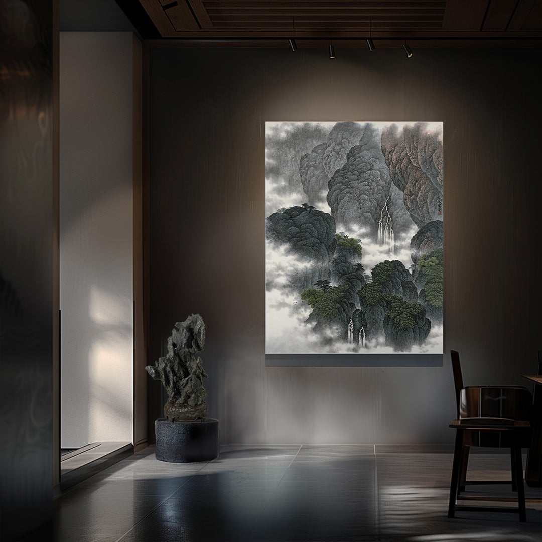 Enveloped in an aura of enigma, the tiered mountains are brought to life through drifting clouds and cascading waters.
