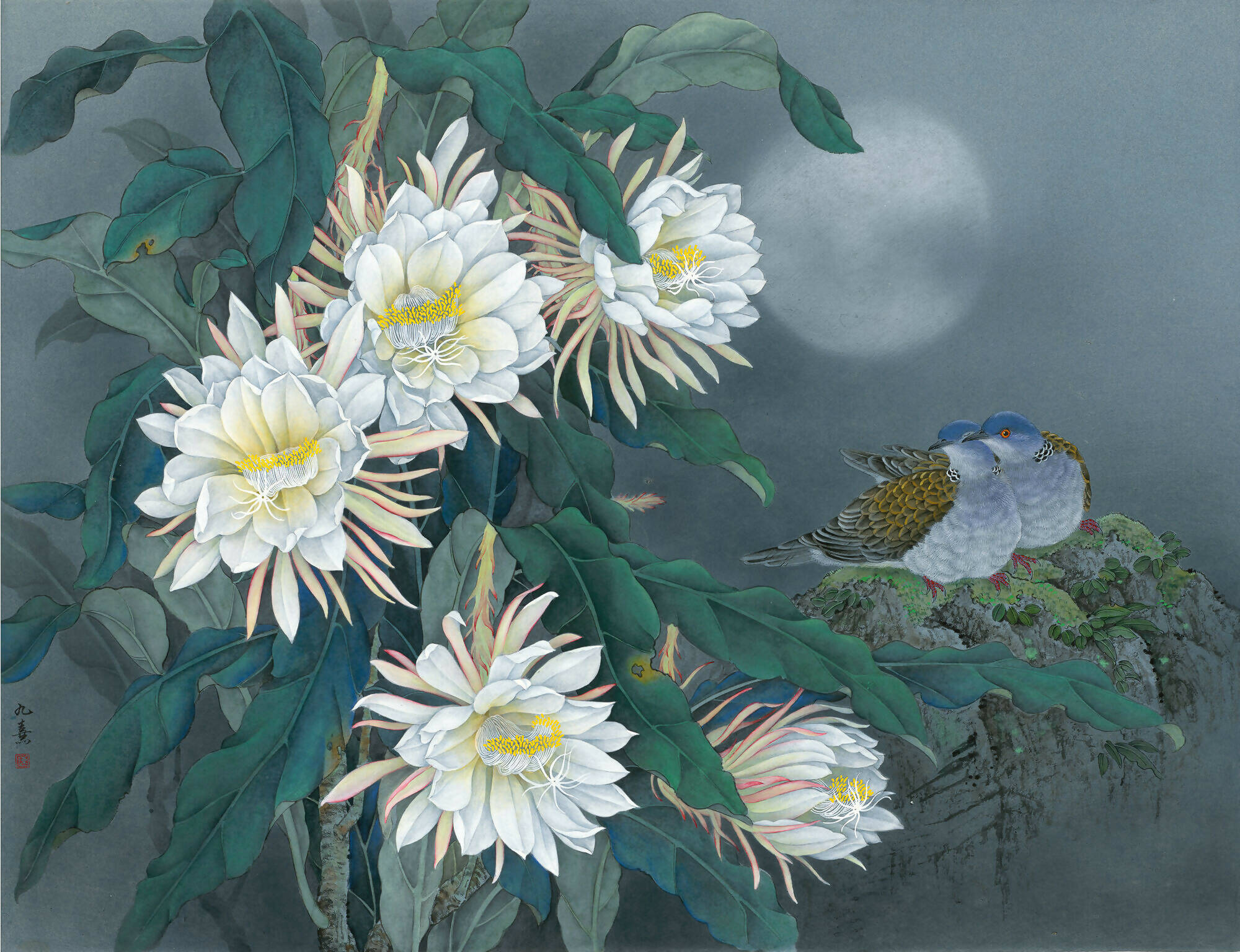 His artistic endeavors extend beyond mastering Gongbi's technique. Chen explores the expressive depths of this art form and broadens its horizons. He innovatively blends traditional Gongbi with diverse mediums: Eastern mineral pigments, Western water-based colors, and contemporary tools like fan-shaped brushes and spray guns. These additions enrich his color spectrum and accentuate the texture and detail of his creations.
