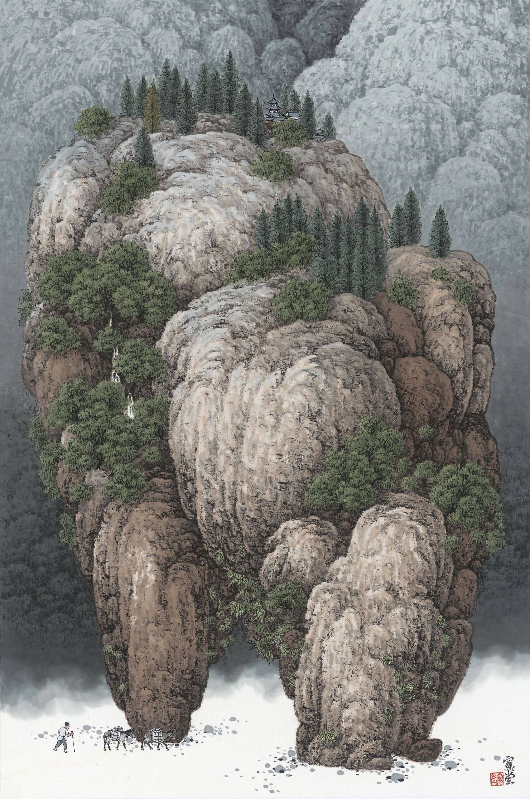 Navigating the serene terrains of Hou Xiantang's paintings, the audience finds itself transported beyond the mundane. Hou employs a distinct M-shaped brush stroke that lends an intriguing blend of vitality and enigma to the mountainous landscapes he presents as his ultimate "hidden paradise." This technique affords remarkable versatility, layering strokes to evoke towering, rugged mountains or employing a softer touch to suggest lush, dense forests.