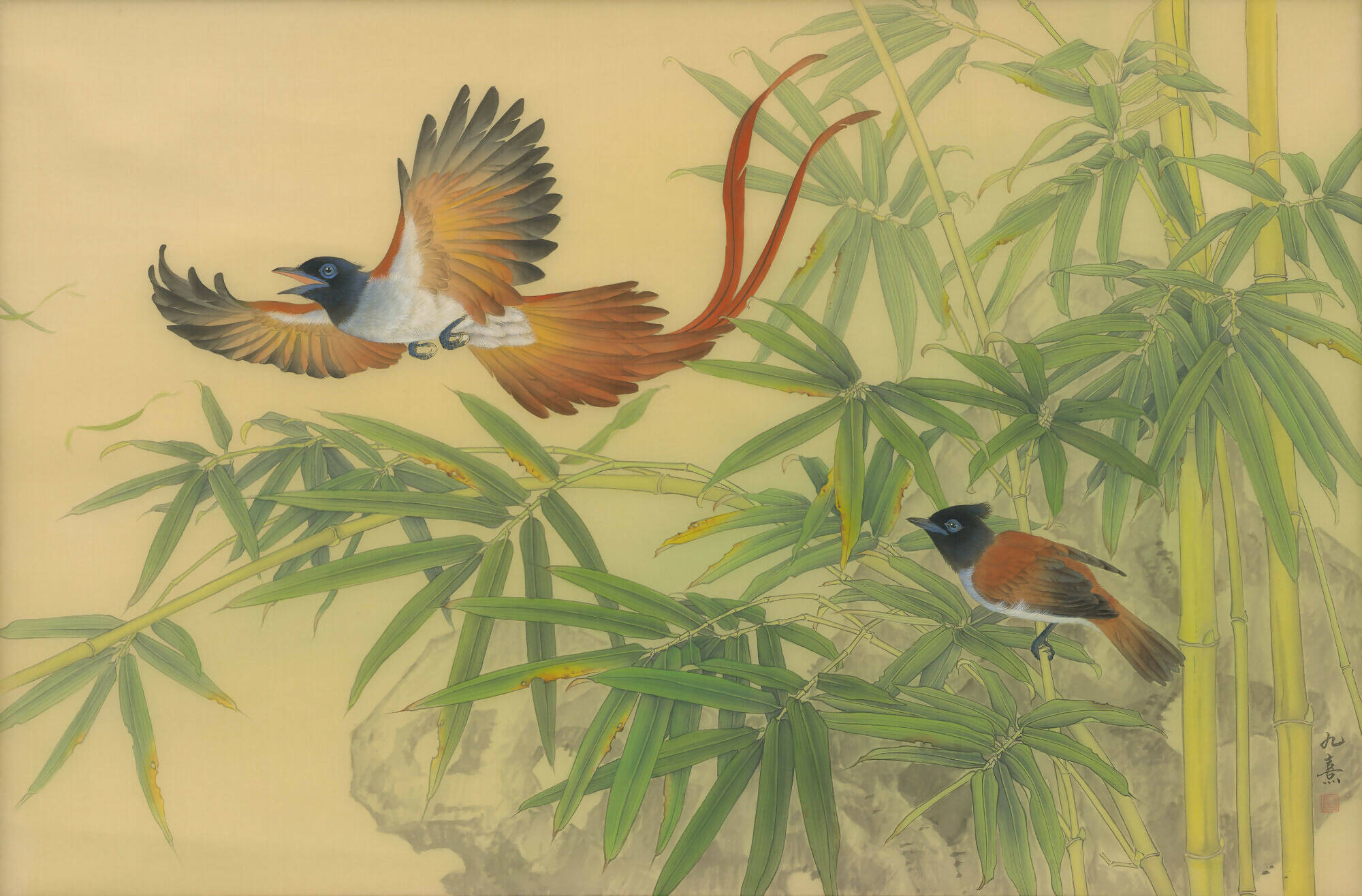 Chen's devotion to capturing nature in its untouched state resonates through his pieces. His astute observations render wildlife's intricate forms and hues with striking accuracy, breathing life into his canvases. More than just mere representation, Chen's pieces narrate dynamic episodes from nature. From the piercing gaze of a bird in flight to the poised readiness in an animal's stance or the inquisitive demeanor of creatures, he effortlessly draws viewers into the animated realms he creates.