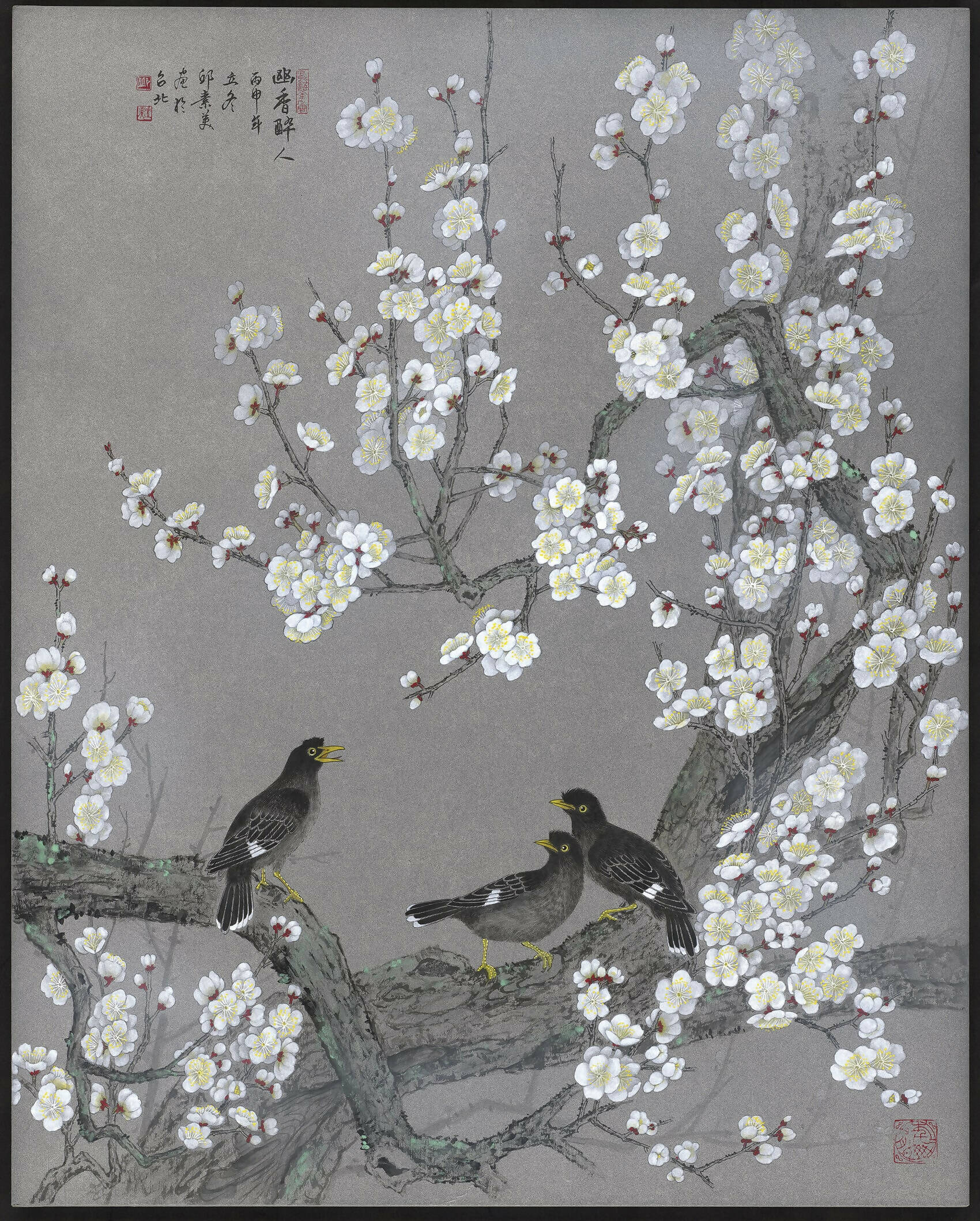 In this elegant artwork, white plum blossoms with light yellow pistils radiate against a subtly inked backdrop. Twisted branches spread the flowers across the canvas like notes in a melodic serenade as if their fragrance extends beyond the frame. Injecting vitality into the visual are three playful mynas perched on branches, seemingly engaged in spirited conversation. It is a piece that reminds us to appreciate life's simple joys.