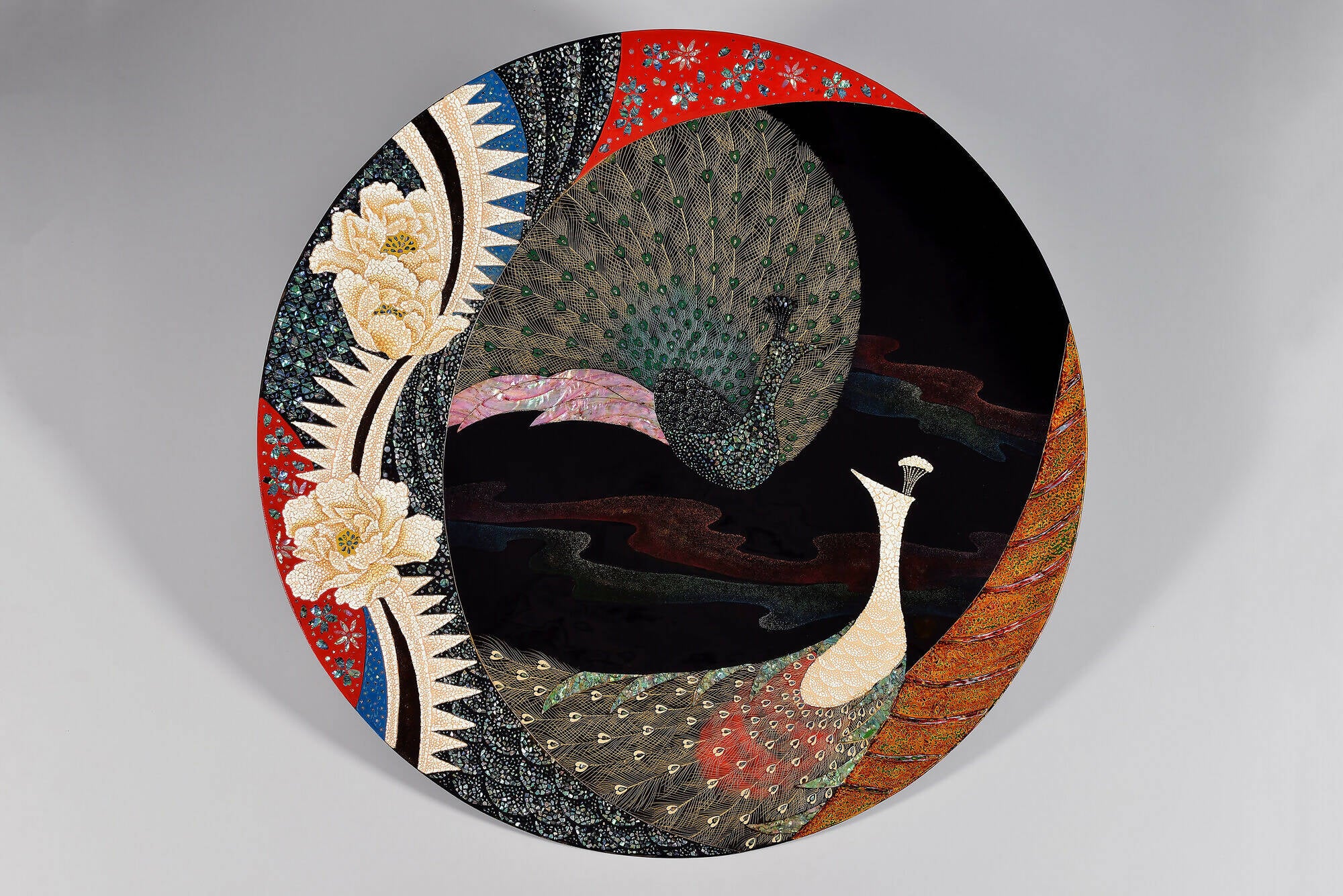 In this masterful composition, lacquer techniques are executed with unparalleled precision, bringing to life the opulence of peonies and the grandeur of peacocks. To the plate's left, the fragile beauty of peony petals comes alive through eggshell inlay. Surrounding these petals are mother-of-pearl inlays that glisten, capturing the ethereal light play that accentuates the pure and poised nature of the white peony blooms.