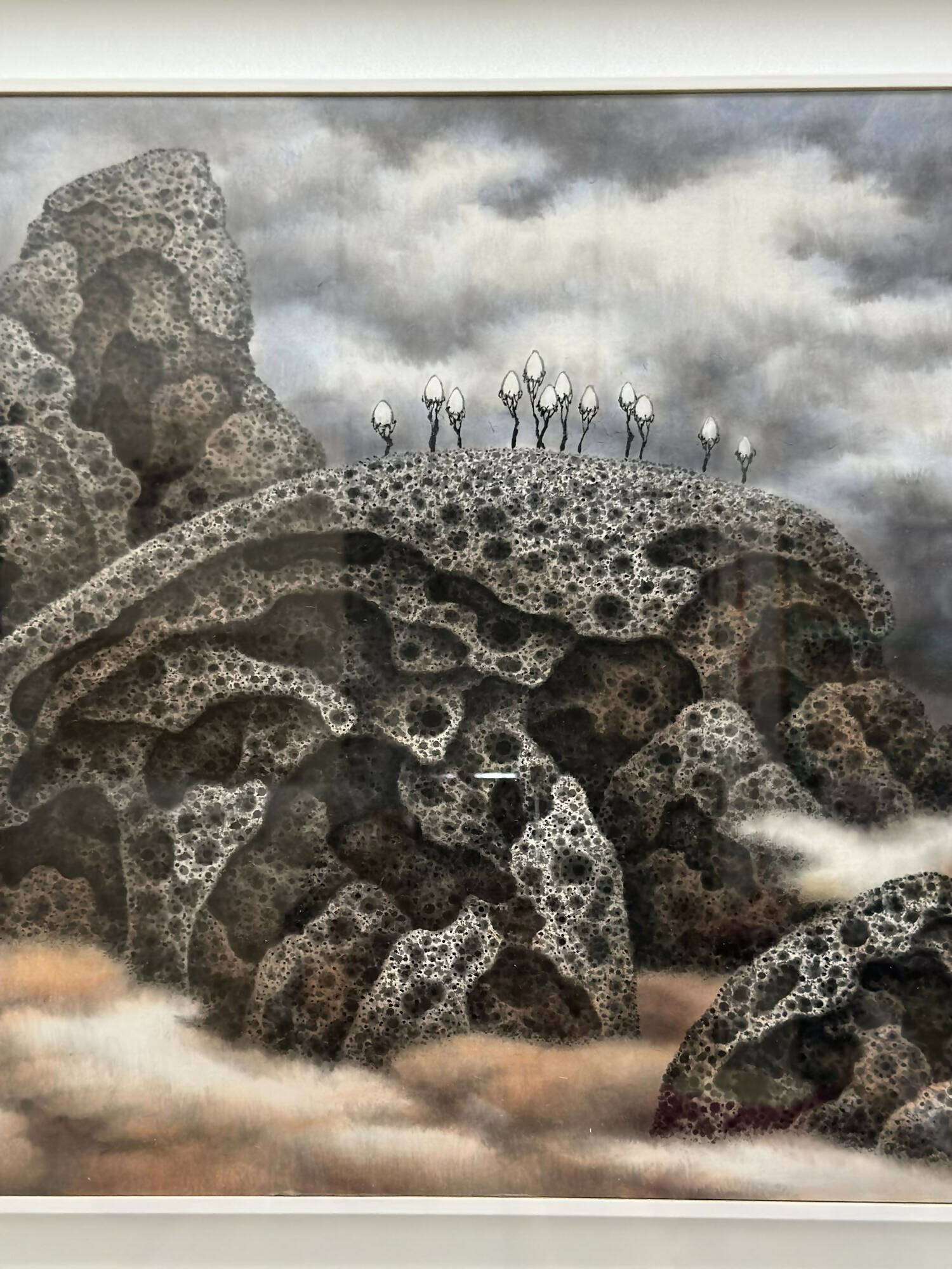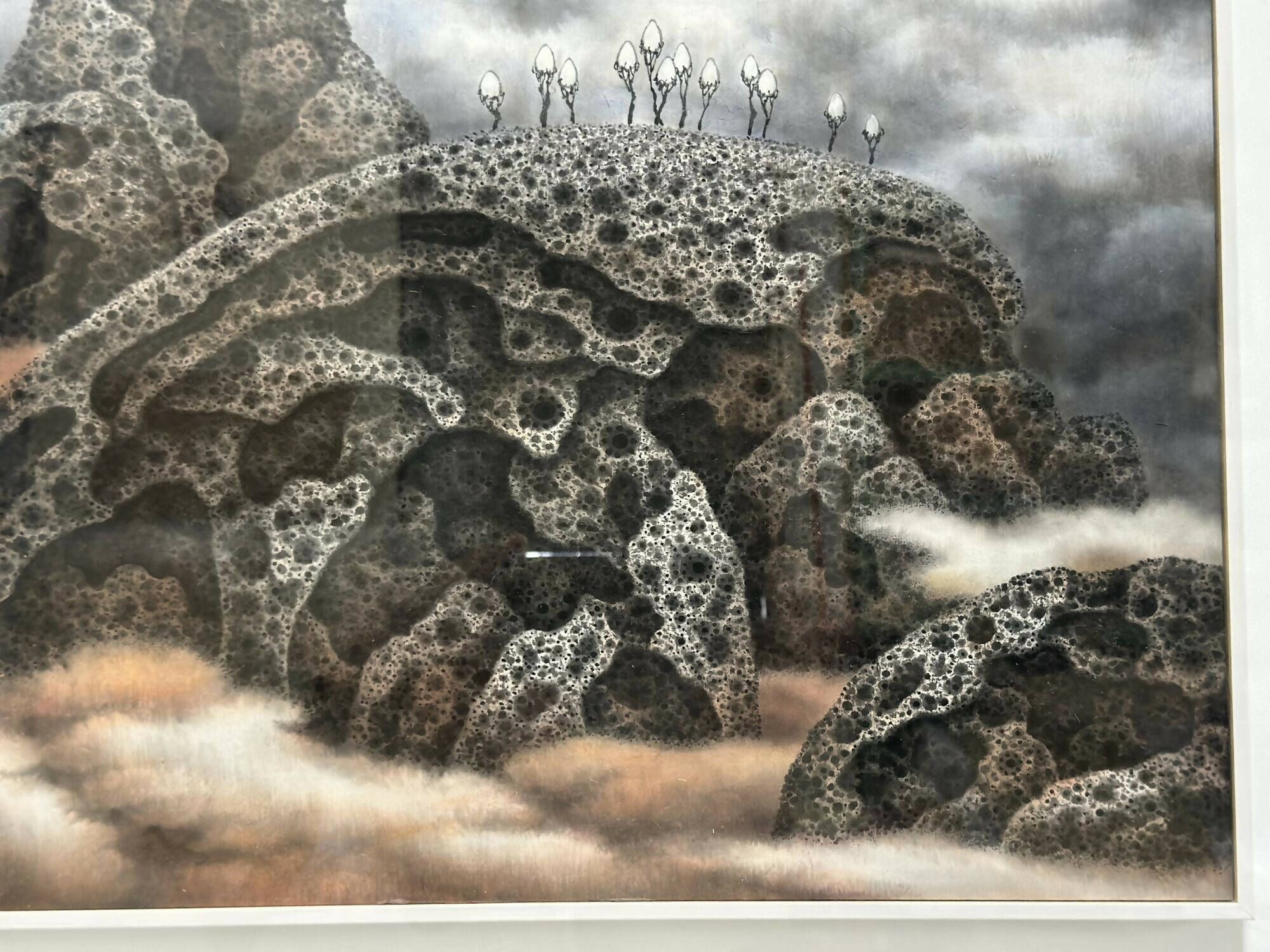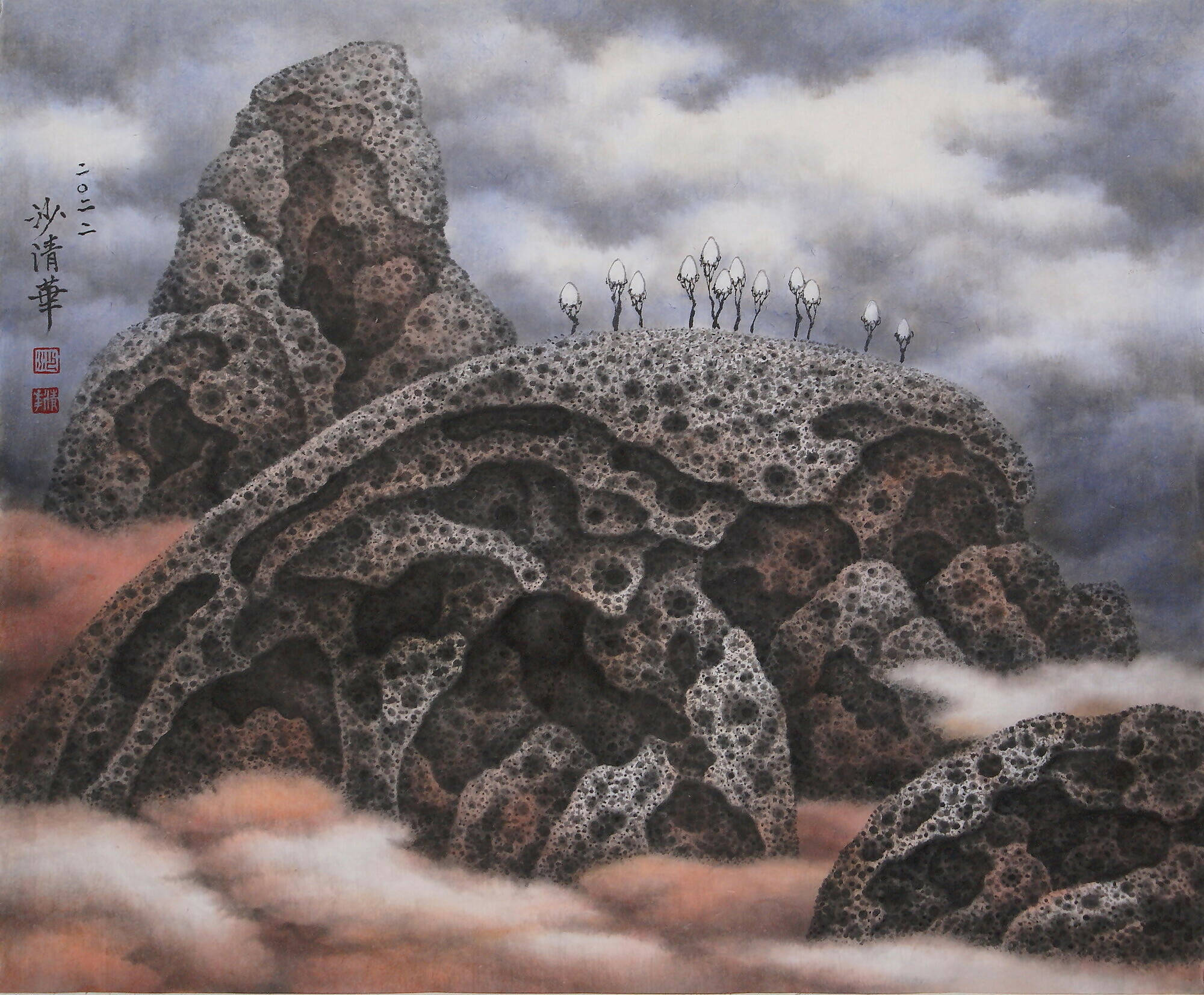 Anchoring this ethereal world are ancient rocks, their surreal textures mirroring the millennia-long weathering seen in "beehive rocks." The realistic depictions of hollow depressions on the rock's surface are achieved through meticulous and repetitive brushwork, which captures the essence of time's passage and hints at the myriad universes they hold.
