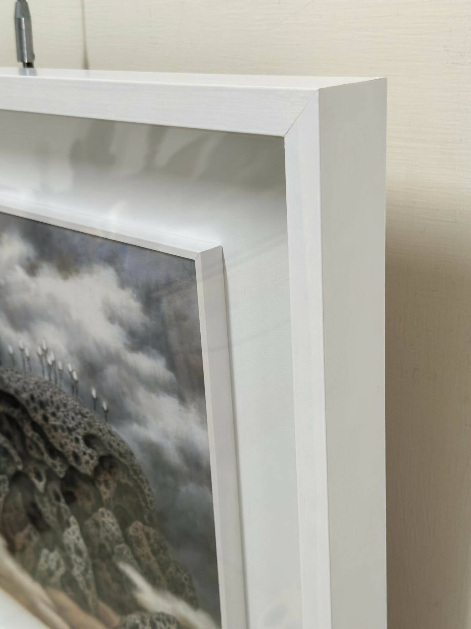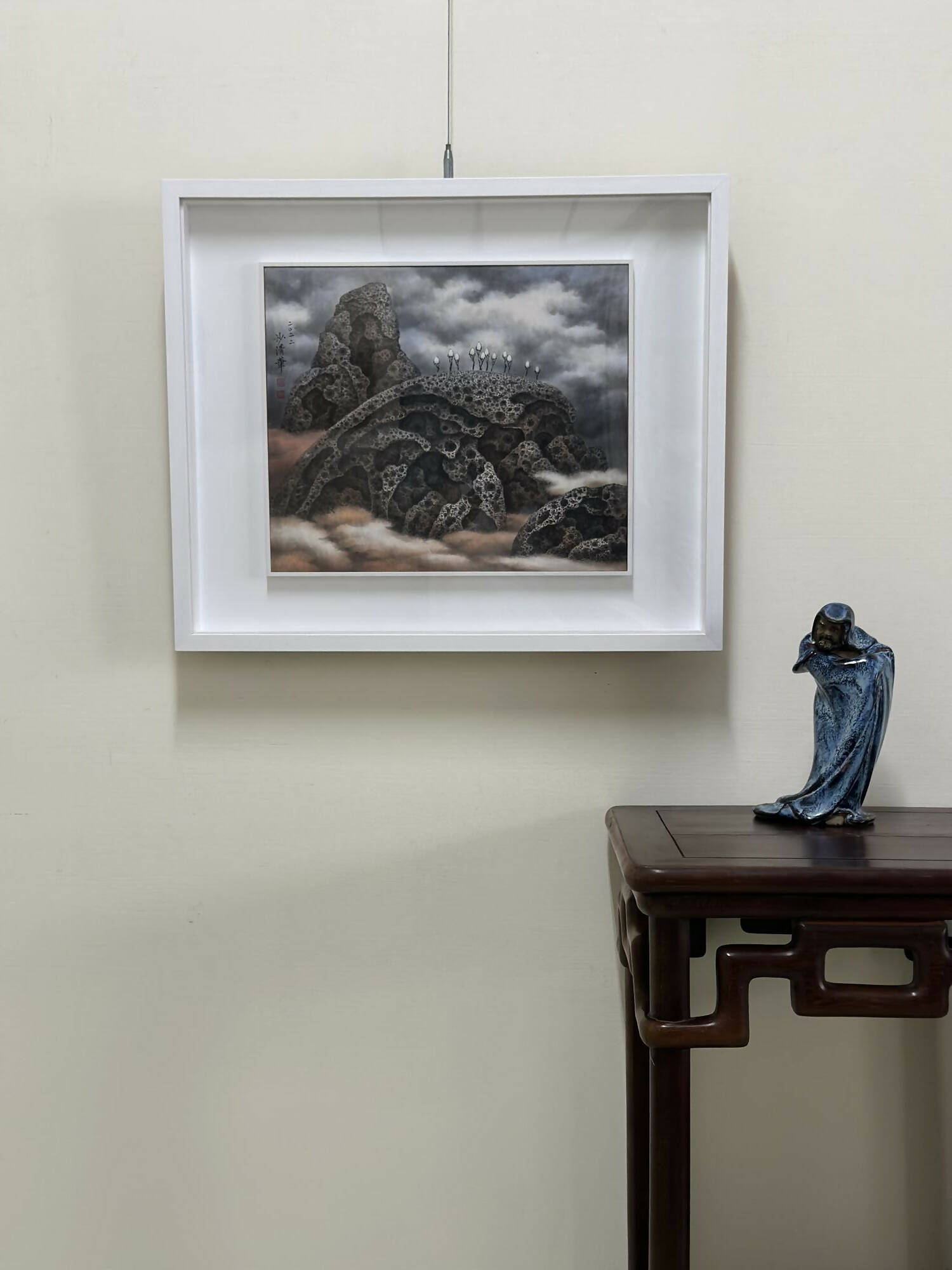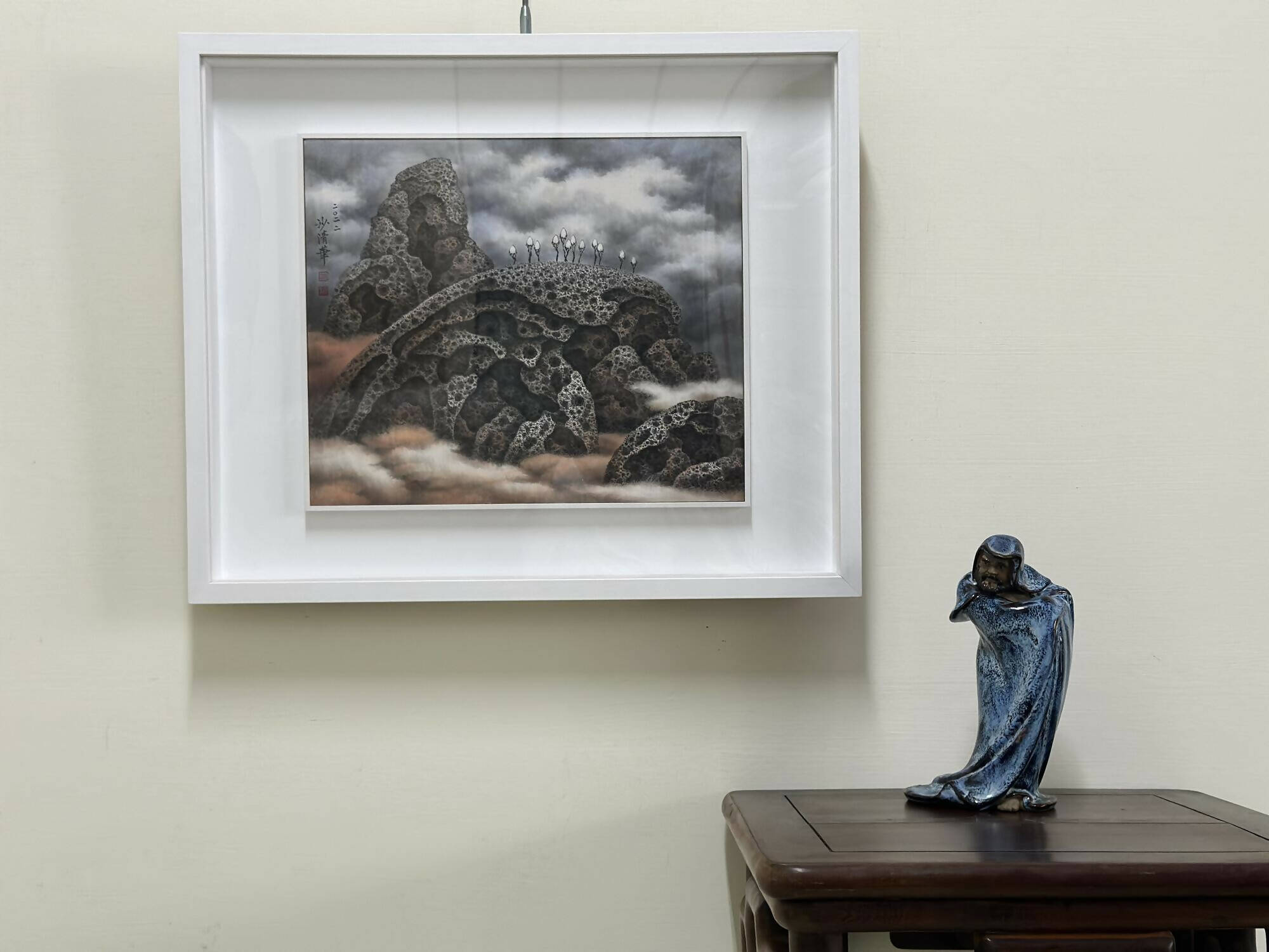 Anchoring this ethereal world are ancient rocks, their surreal textures mirroring the millennia-long weathering seen in "beehive rocks." The realistic depictions of hollow depressions on the rock's surface are achieved through meticulous and repetitive brushwork, which captures the essence of time's passage and hints at the myriad universes they hold.