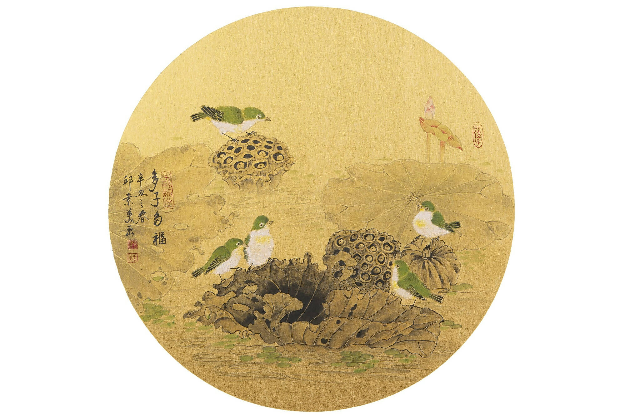 "Birds Among Lotus Pods" features vibrant green birds perched among withered lotus leaves and pods, injecting life and colour into the scene. In a subtle yet captivating touch, a pale pink lotus bud emerges in the distant upper right corner, quietly unfurling above the water and drawing the playful gaze of the birds. In this piece, the artist beautifully captures a moment of life unfolding amid the gentle ripples, using a dynamic blend of colour and subtlety.