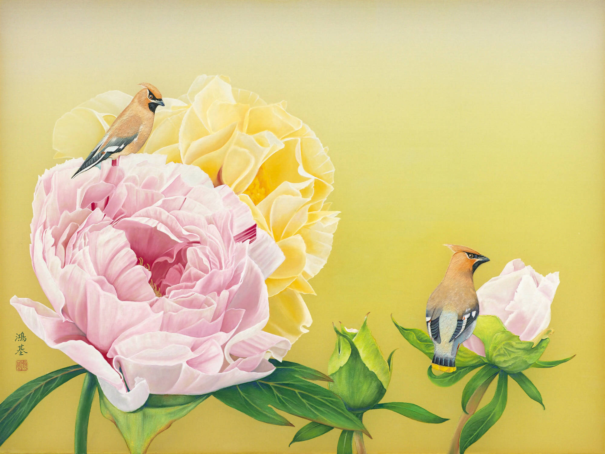 In the composed tranquility of the piece, lush peonies unfold their silken petals in a gentle bloom, each layer rendered with a delicate, warm glow that captivates a pair of birds. Articulated with thoughtful precision, these avian creatures linger amidst the blossoms, their postures suggesting a shared moment of admiration and repose amid the flourishing tableau.