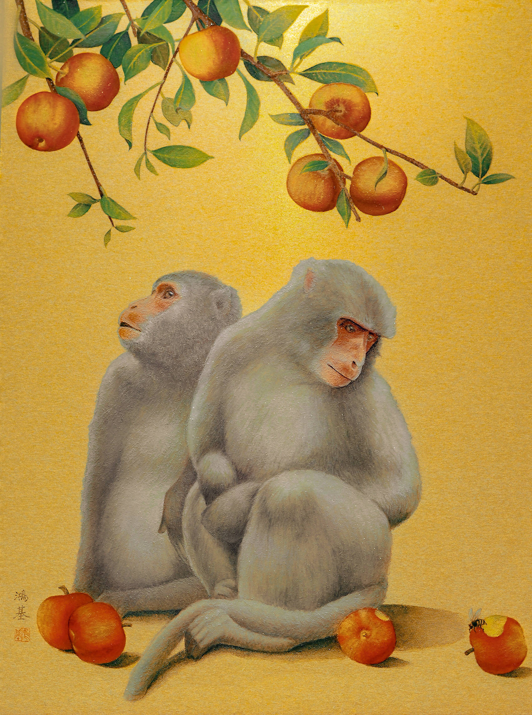 Illuminated by a golden glow background, meticulously rendered with pure mineral pigments, the visual pays homage to autumn's bountiful harvest. Succulent, plump fruit hanging tantalizingly from branches beckons a mischievous monkey into the scene. The monkey plucks a fruit, its bite crisp and purposeful, only to whimsically discard it upon the rich, earthen ground below. Subsequently, it assumes a silent vigil, its eyes following a bee as it descends upon the bitten fruit. It is a simultaneously vibrant and still scene, capturing nature in a candid, playful motion.