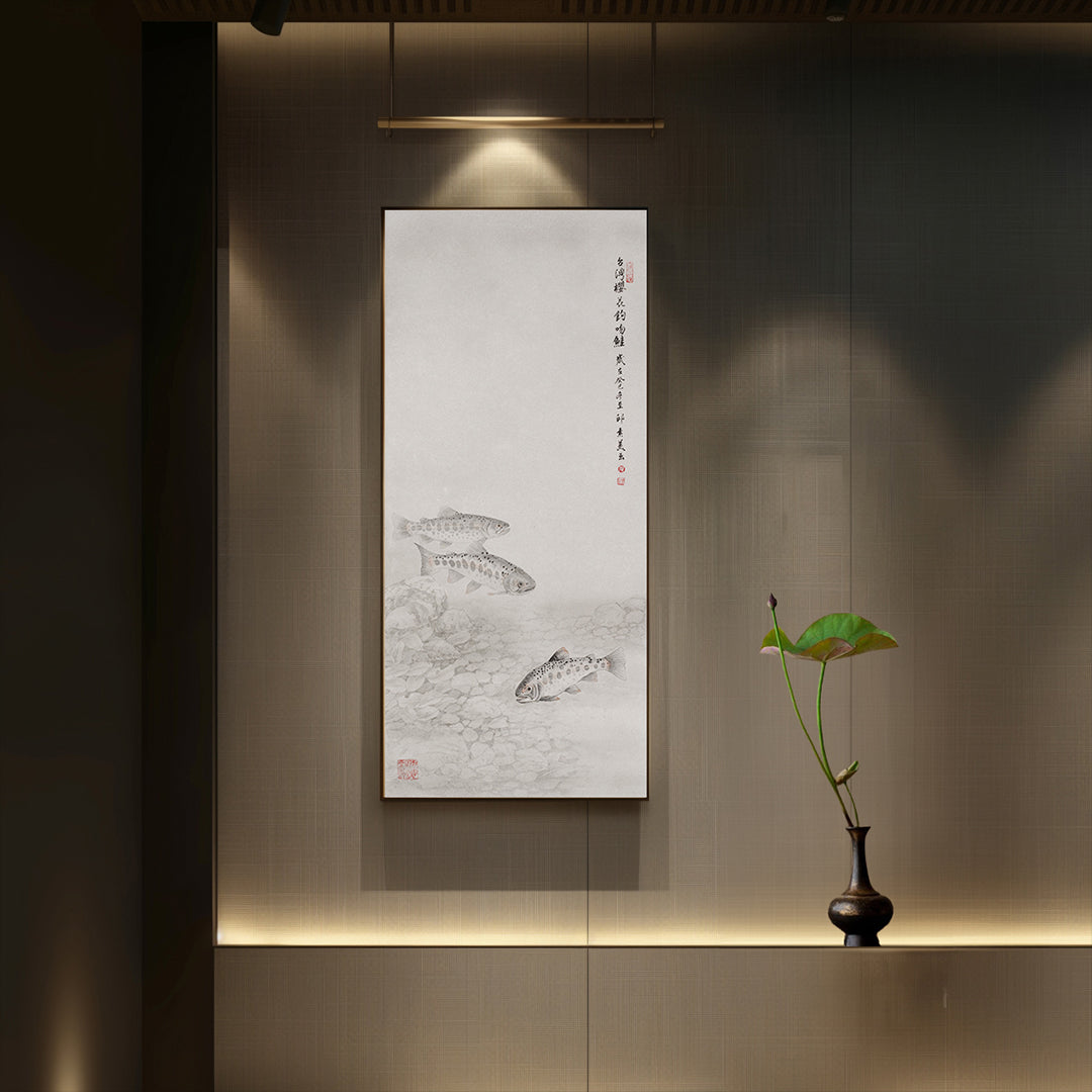 The artist uses delicate ink-wash techniques to create a nuanced spectrum of gray tones. The upper half of the composition is purposefully sparse, inviting the audience to imagine an expansive water environment and evoking a sense of boundless freedom.
