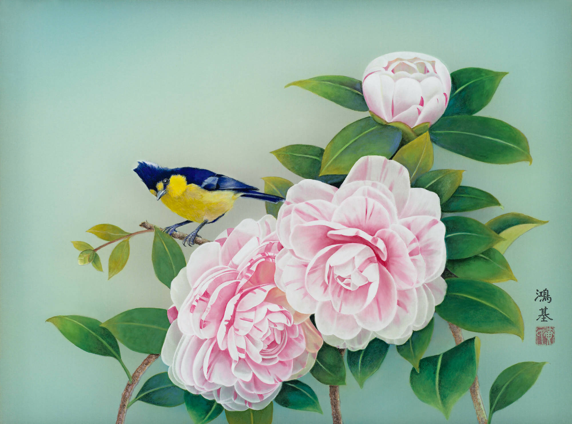 A delicate flower rendered meticulously with subtly glittering mineral pigments leans gently into another, evoking the quiet intimacy of enamored companions. It gleams with exquisite luster and translucence, just like the pure splendor of a finely cut gem. Perched above, a bird, resplendent with its vibrant feathers, observes the floral tableau with curiosity and fascination as if an enthusiastic spectator at a theatrical performance.