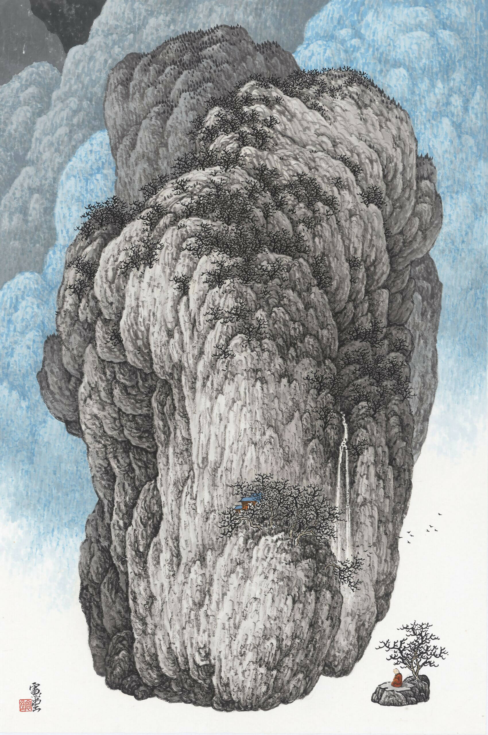 Navigating the serene terrains of Hou Xiantang's paintings, the audience finds itself transported beyond the mundane. Hou employs a distinct M-shaped brush stroke that lends an intriguing blend of vitality and enigma to the mountainous landscapes he presents as his ultimate "hidden paradise." This technique affords remarkable versatility, layering strokes to evoke towering, rugged mountains or employing a softer touch to suggest lush, dense forests.