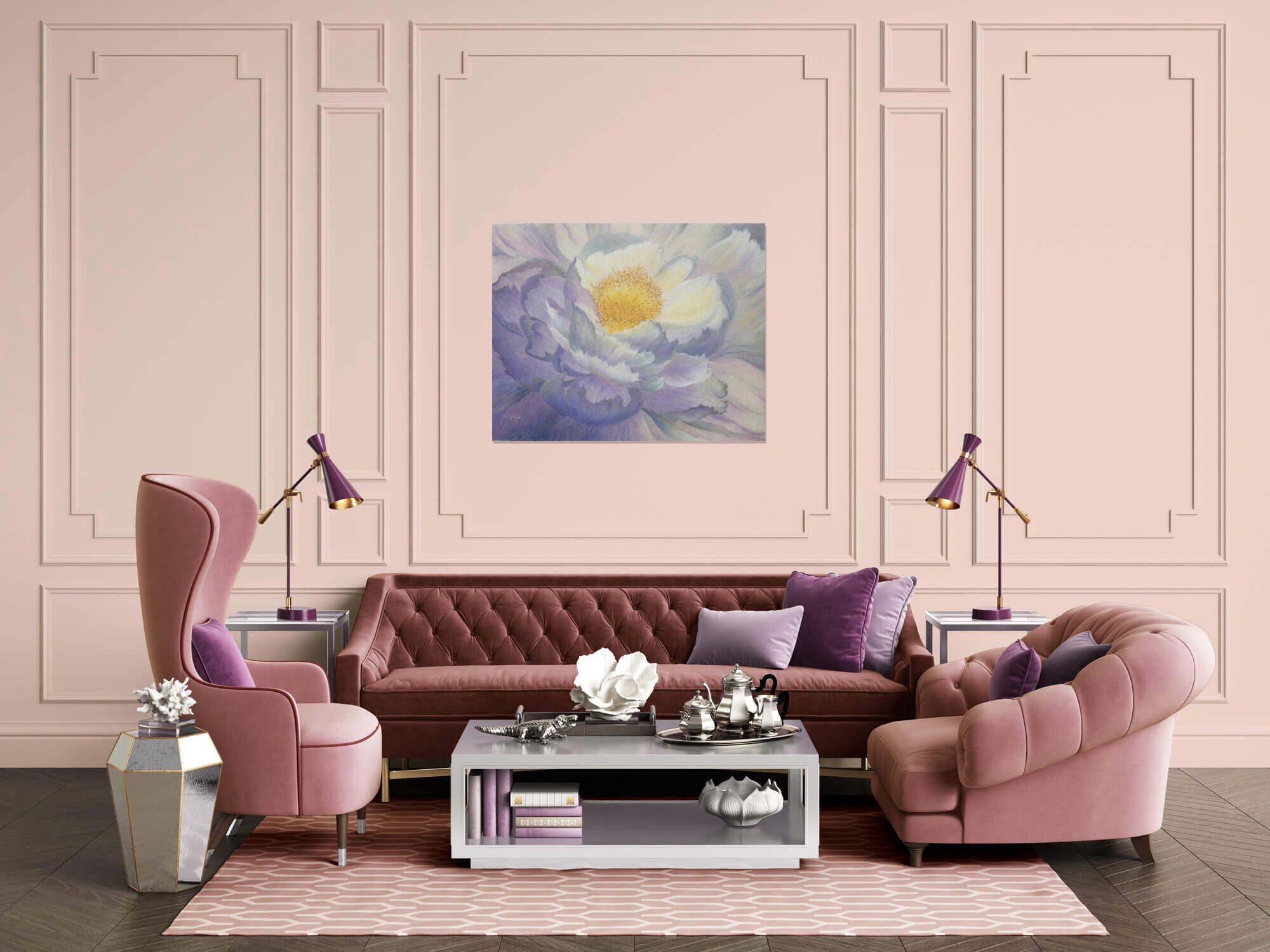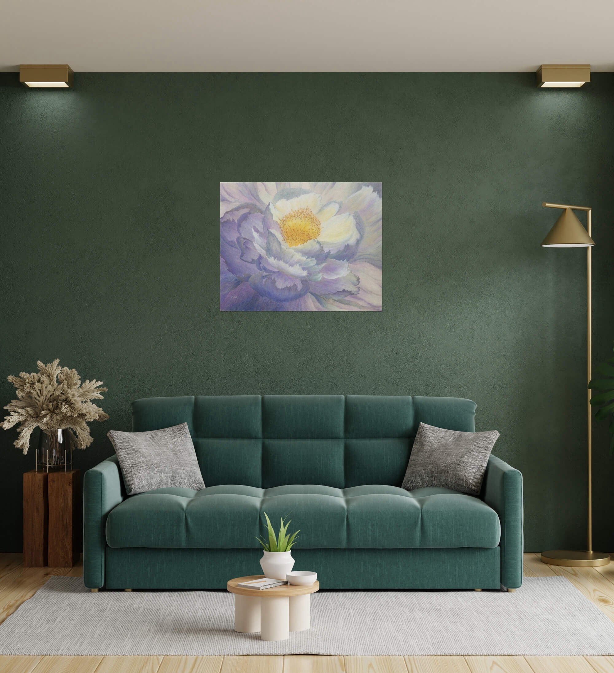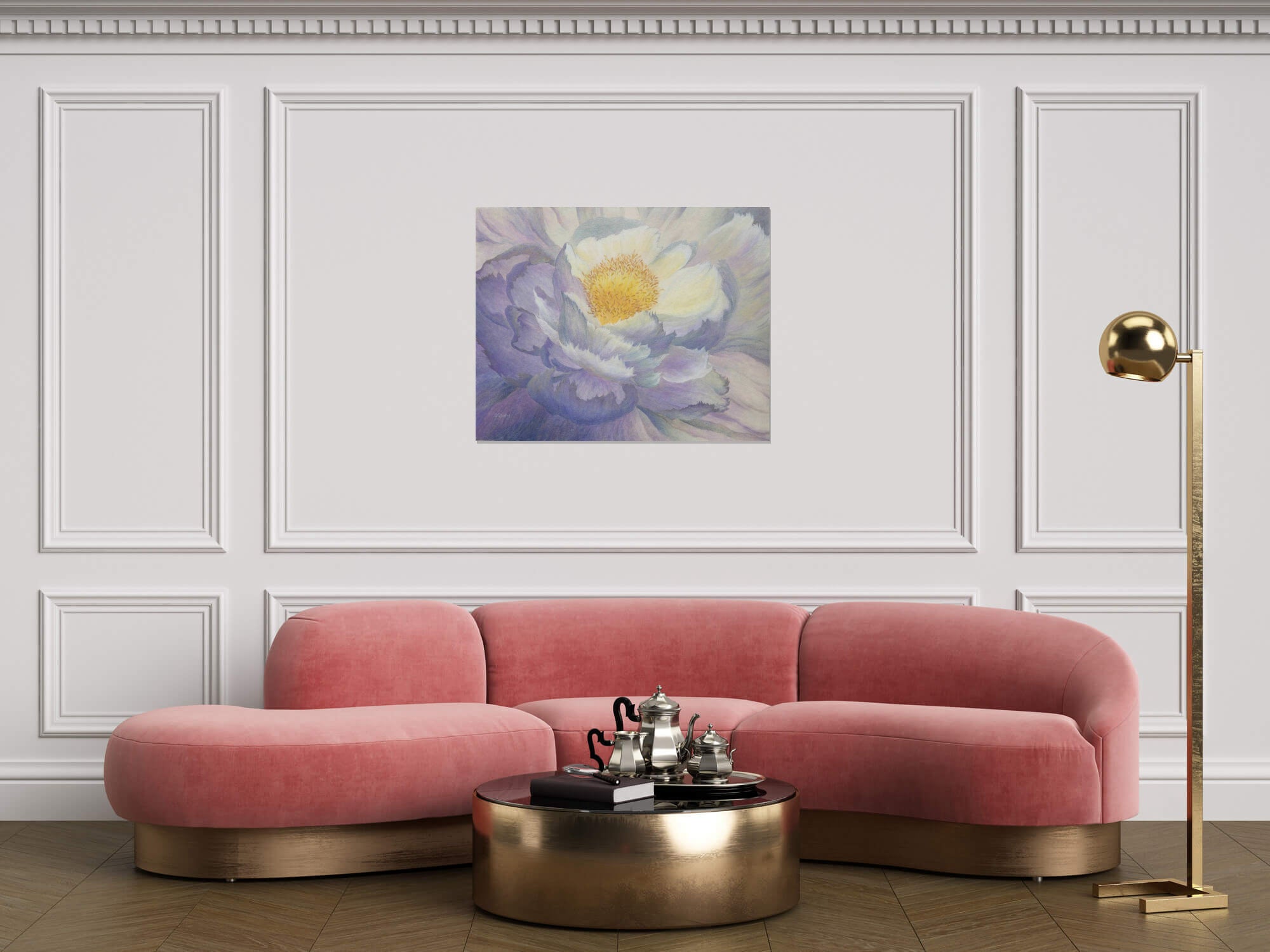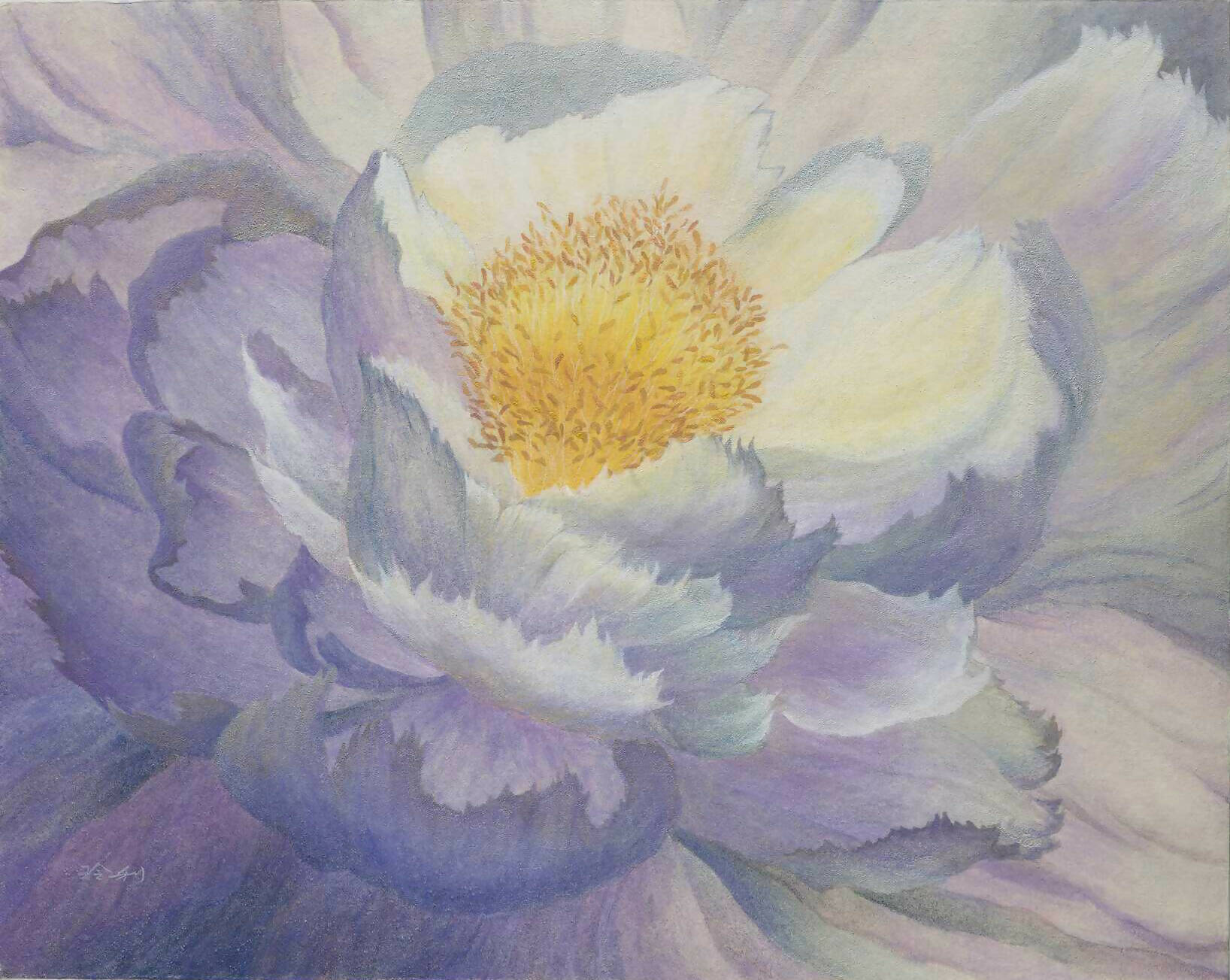 In Liu's painting, the dainty purple petals of the flower have tenderly unfolded, revealing a golden center laden with pollen—a promise of more life and beauty in the future.
