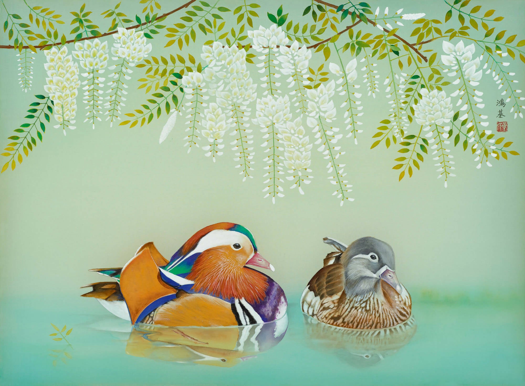 Delicate clusters of white wisteria cascade gently, creating a romantic ambiance. Below, a pair of mandarin ducks glide leisurely across the clear water, their intricately rendered feathers aglow, seemingly radiating an aura of affection. The scene unfolds a poignant narrative of partnership and mutual admiration, inviting the audience to linger in a tableau that intertwines natural elegance with symbolic richness.