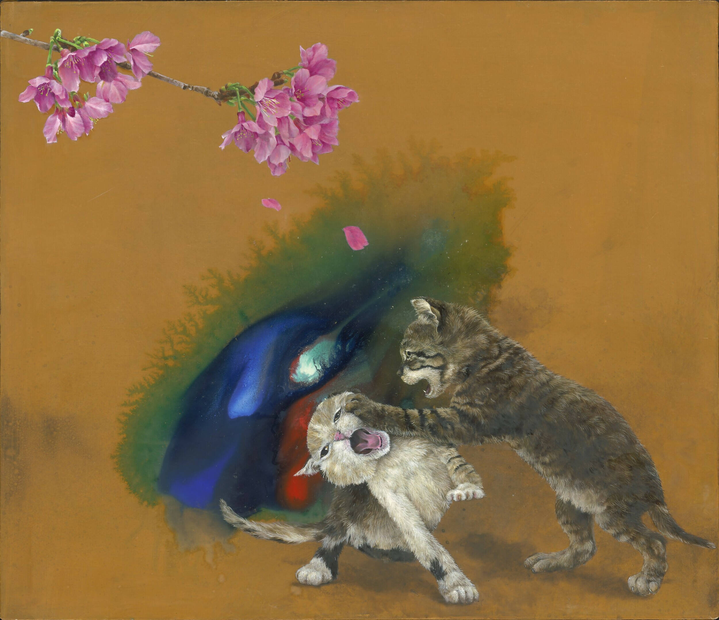 In this lively artwork, two playful kittens are deeply engrossed in a match. The expert portrayal of their contorted cheeks and raised paws flawlessly captures the dynamic fervor of their movements. To accentuate the sense of vigor, the scene is adorned with a pair of fallen petals from pink flowers in the top left corner, infusing the artwork with a delicate touch of imagination and vitality.