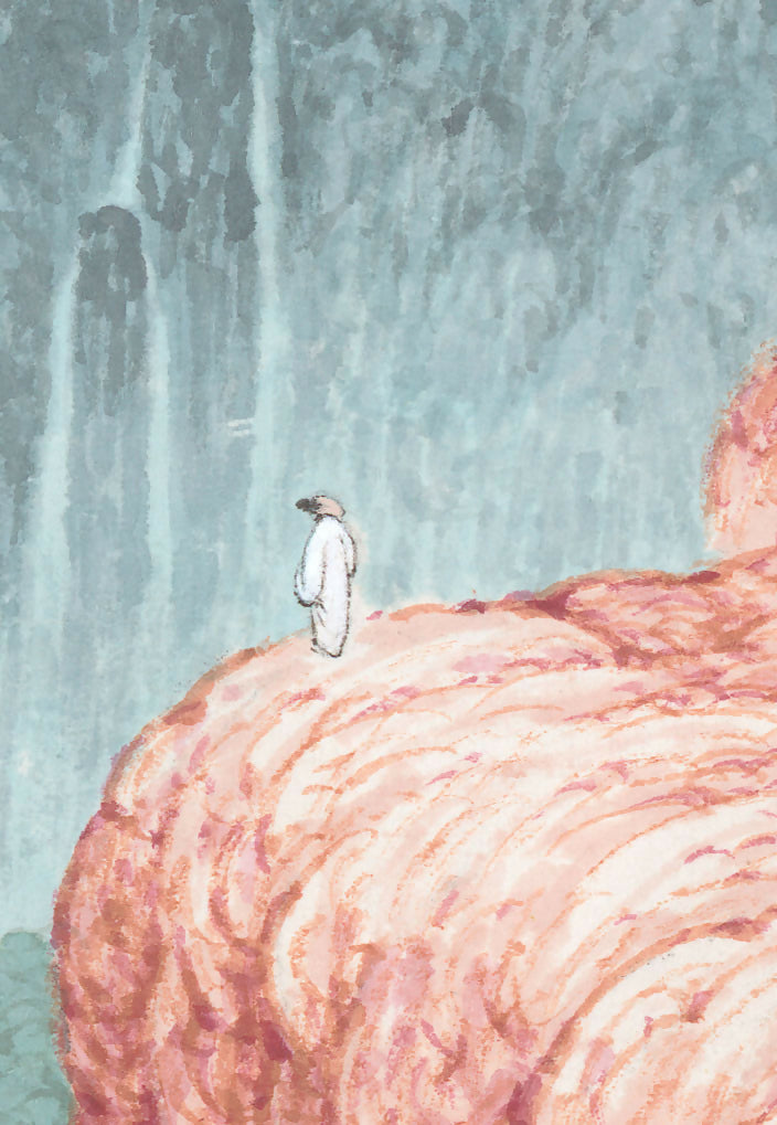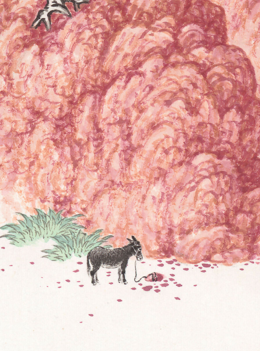 Positioned atop the mountain, the protagonist's journey is hinted at by the presence of a small donkey at the foothill. Entitled "Geese Flying," the painting depicts the man delighting in the spectacle of geese migrating south. He wears a flowing white robe, captured with fluid ink strokes, evoking a sense of detachment from worldly concerns and inviting viewers to immerse themselves in the spirit of liberation and expansiveness, like the geese soaring freely through the boundless skies.