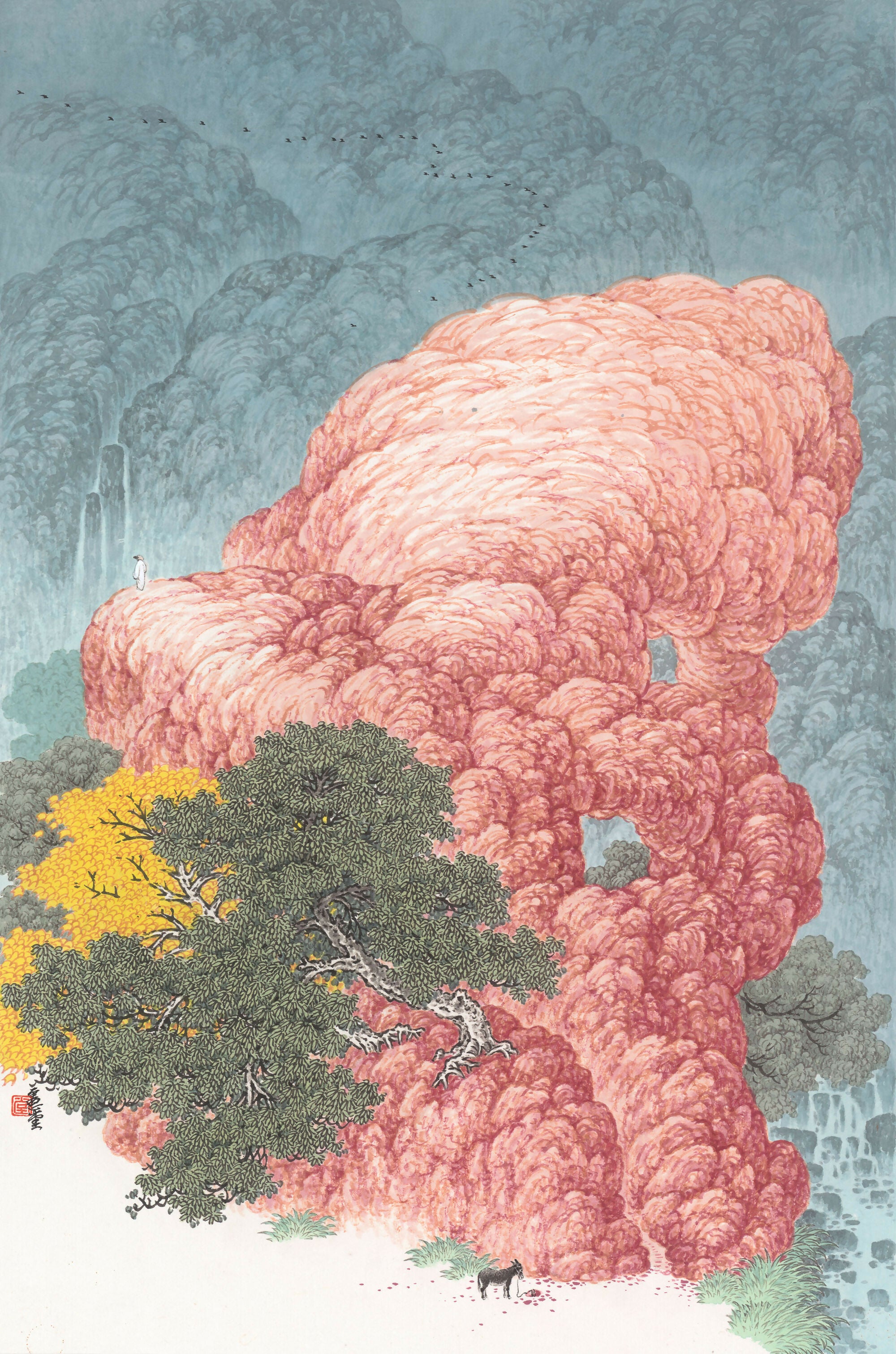 The mountain in the foreground is rendered in a distinctive cinnabar hue, conjuring an autumn tableau that remains lively despite the absence of trees. The presence of two mysterious holes in the rock stirs the imagination, indicating perhaps a portal to a mystical world.