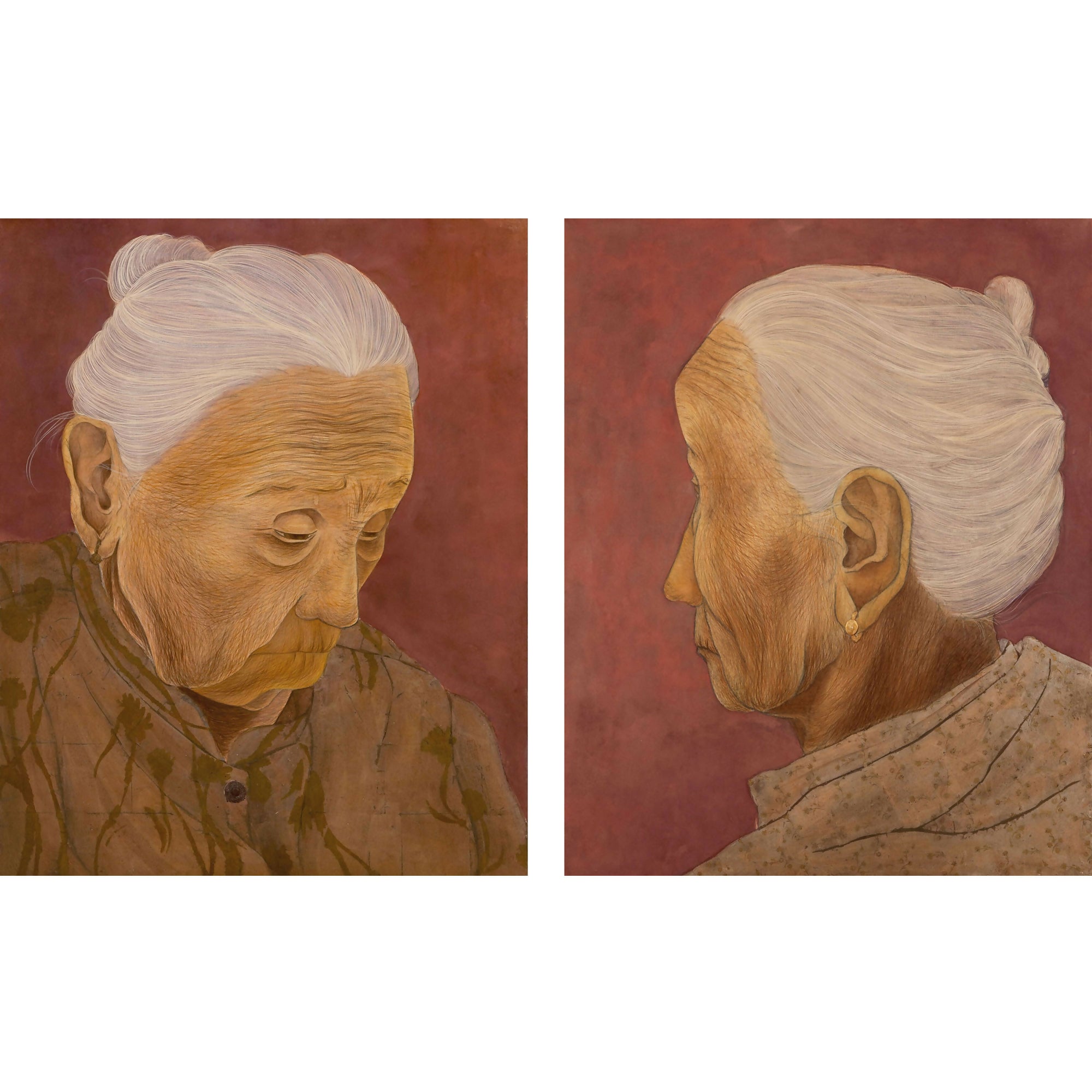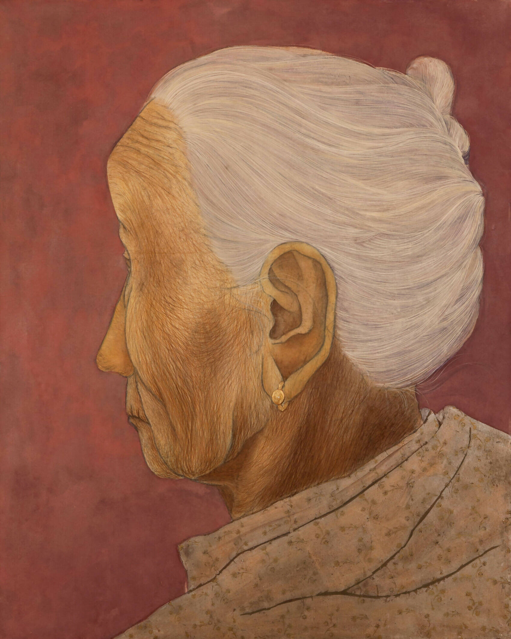 In this intimate portrait, the artist renders her grandmother's lifelike hair and skin with remarkable fluidity, achieved through countless delicate lines that serve as both a metaphor for the passage of time and a testament to their enduring emotional bond. Enhanced by silver foil accents, her neatly arranged attire and hair strike a compelling balance between simplicity and complexity, inviting endless interpretation and emotional engagement. It's a masterful display of the artist's technique and how she can inject raw emotion into her work.