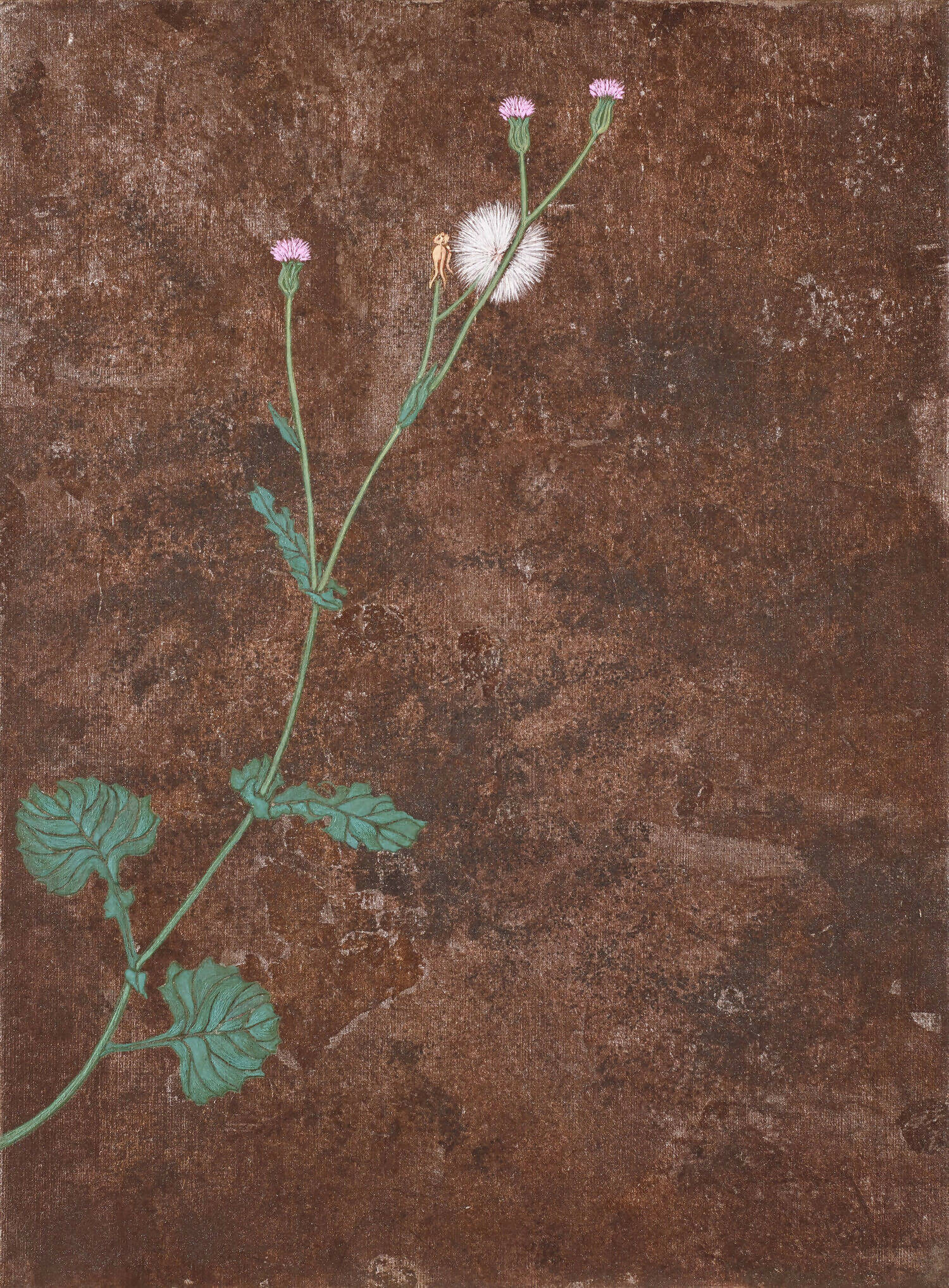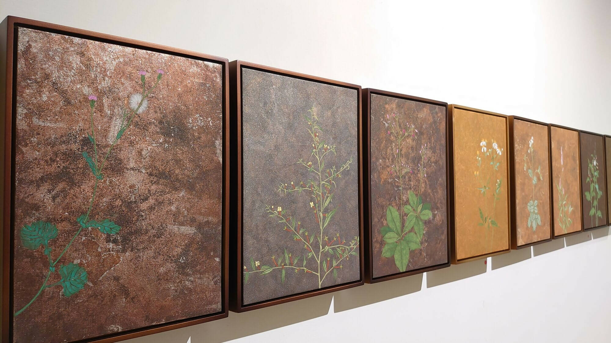 In the artist's evocative series "Wild," she masterfully renders often-overlooked flora such as purple bladderwort, water fringe, and greater dodder. These wild plants, resilient in their natural habitats yet seldom cultivated domestically, come to life on the canvas in extraordinary detail. The background is far from an afterthought. Instead, it is a meticulously layered construct in subdued earth tones, acting as a foil to the wildness of the plants it frames. When juxtaposed against the intricate veins and blossoms of the featured flora, this textured backdrop yields a raw, unmanicured aesthetic that effortlessly evokes an authentic connection to the untamed world.