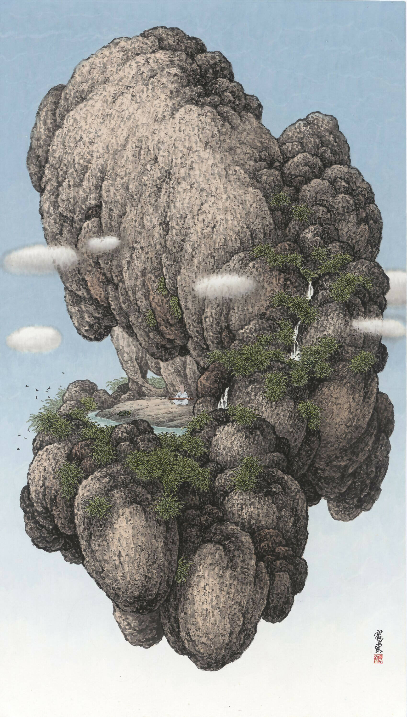 In this piece, the artist's signature M-shaped brush strokes render a suspended mountain with rough terrains, surrounded by wisps of white clouds, lending it an air of enigmatic transcendence. A waterfall winding about lush greenery makes the ethereal scene even more mistifying. Nestled within this natural sanctuary is a monk engrossed in playing the zither. The sounds suggested by the provocative visual—of powerful cascading water harmonizing with the zither's haunting melodies—invites the audience to remove themselves from life's daily distractions and indulge in an immersive and serene moment in this otherwordly realm.