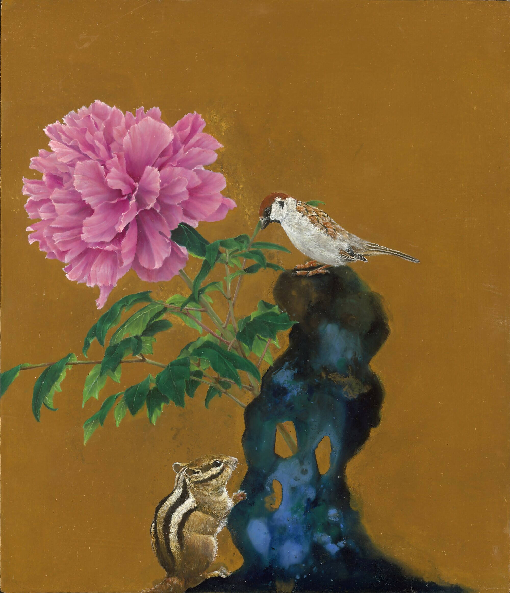 "In Spring" captures a radiant peony in full bloom, signalling the arrival of the season and drawing the attention of inquisitive sparrows and chipmunks. Below the beautiful floral canopy, a chipmunk gazes up at the sparrows perched on the branches as if asking, "Have you noticed that spring has arrived?" To which a sparrow responds, "Indeed it has! Haven't you awakened from your hibernation?"