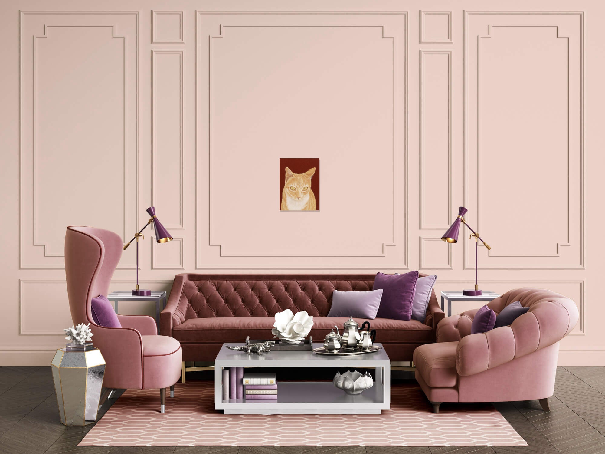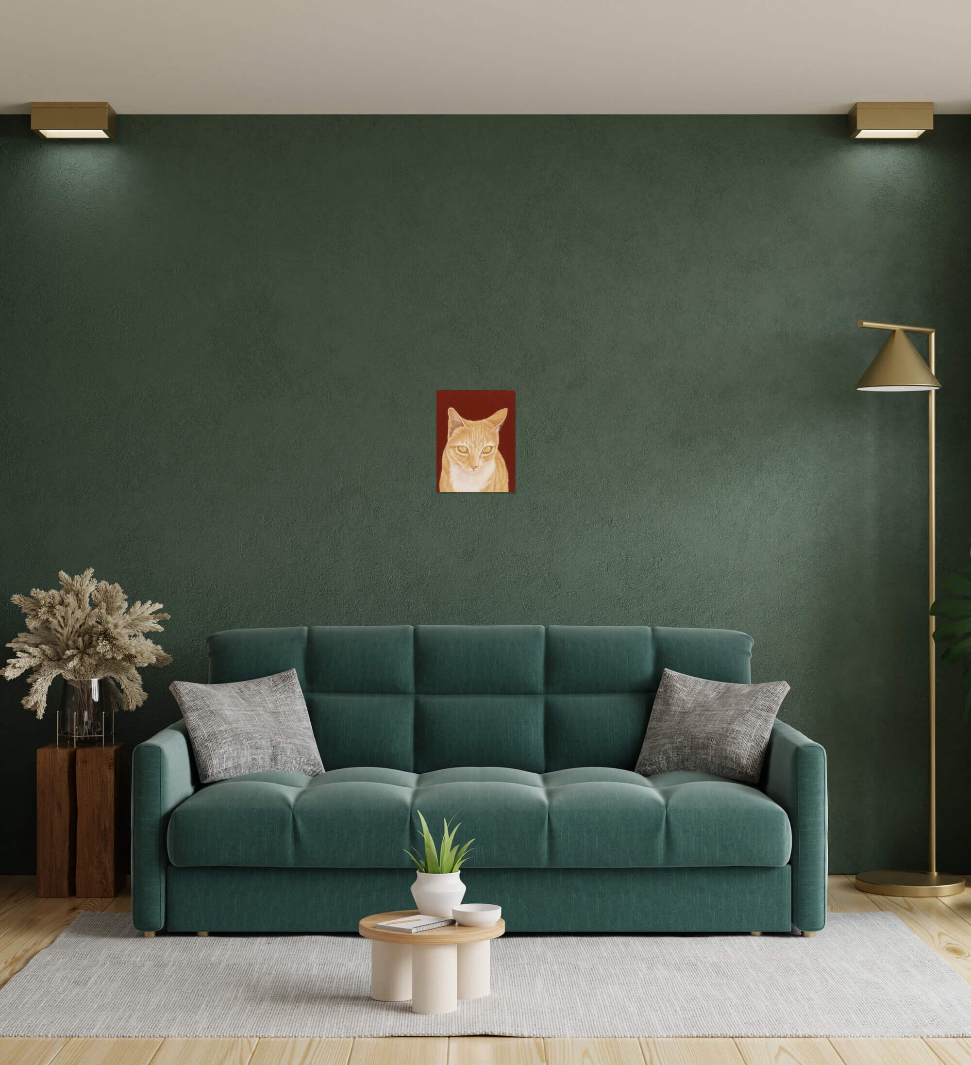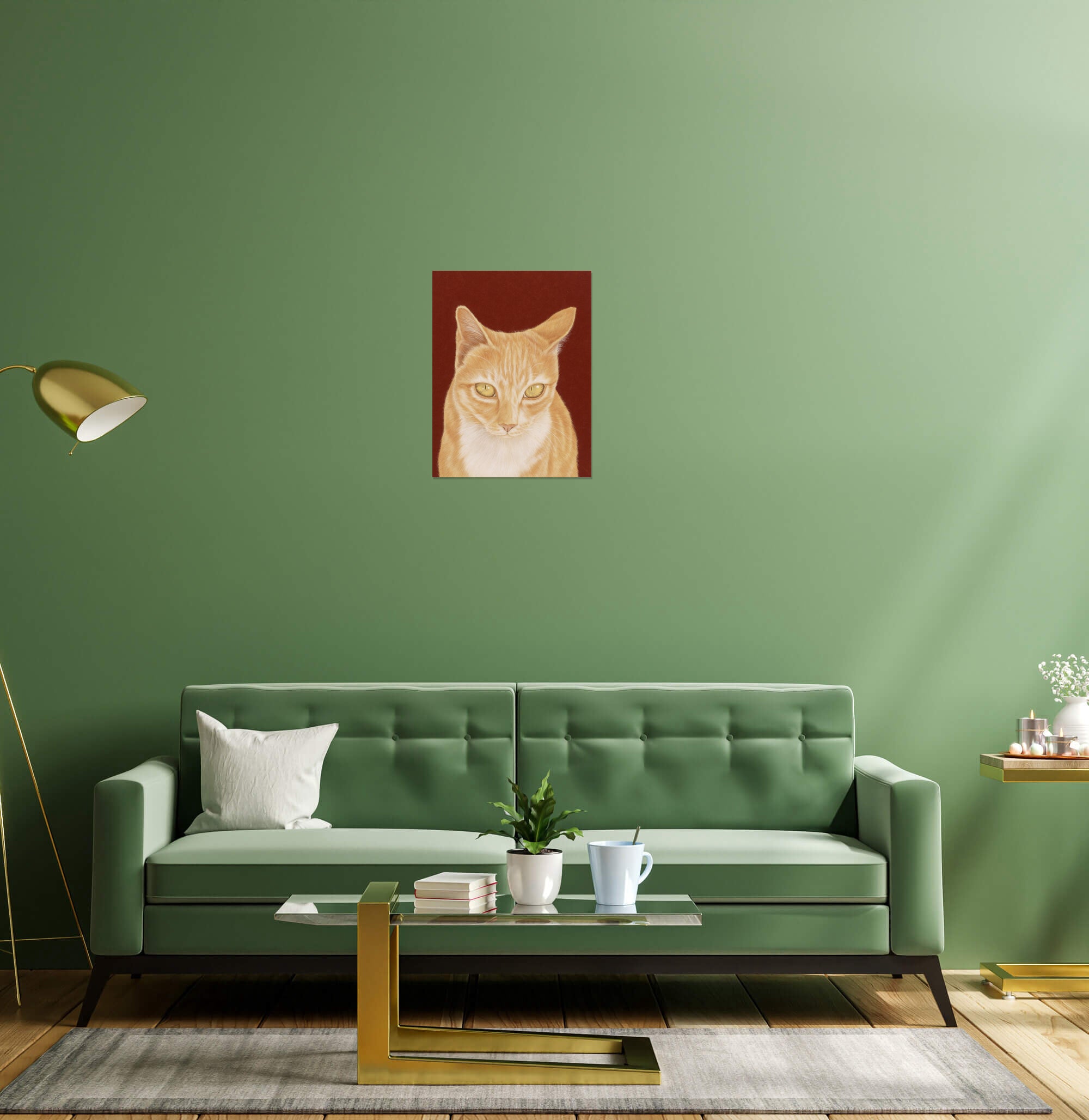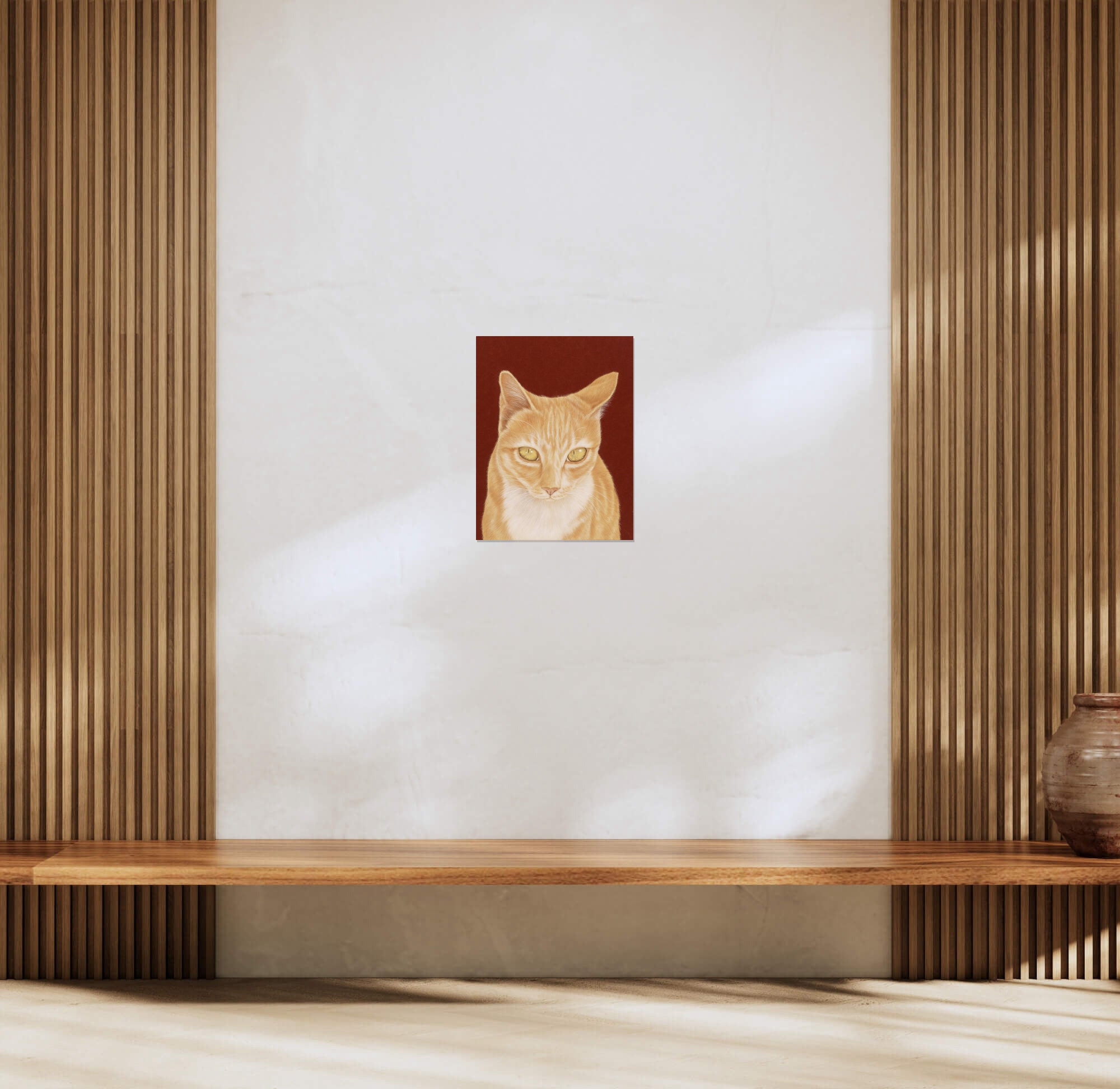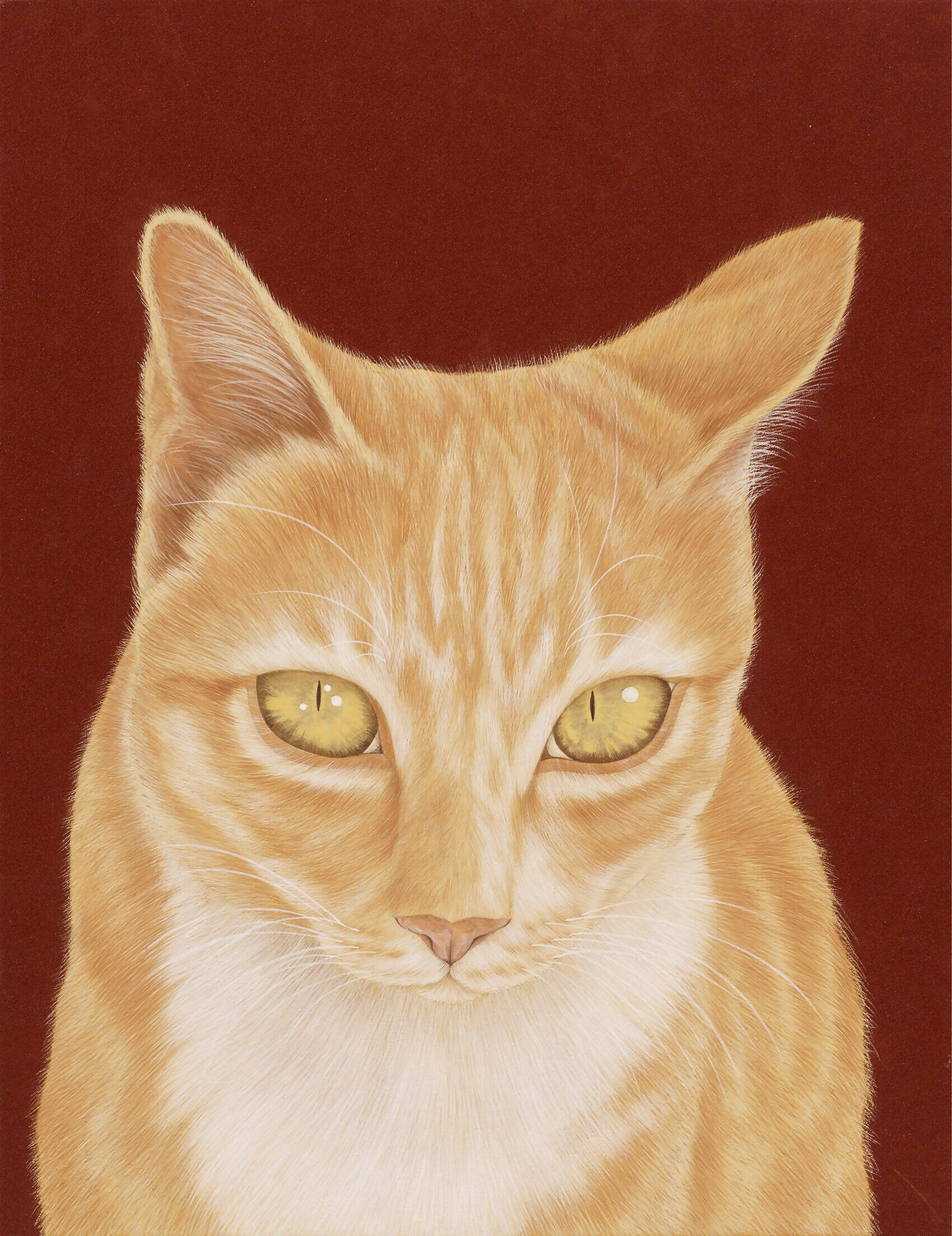 Captured in exquisite detail, the orange cat in this piece connects with the viewer through its amber-coloured eyes filled with curiosity and attentiveness. Its realistic velvety fur and tabby patterns were created with fine, precise lines, taking on a tangible quality that exudes warmth and reassurance. The artist encourages the audience to engage in a tranquil gaze with the subject, creating a liminal space between awareness and unconsciousness. The life-like rendering serves as a poignant reflection of the emotional nuances and expressions we encounter in the faces that populate our lives, making this piece not merely an object of aesthetic admiration but also a mirror of our shared human experience.