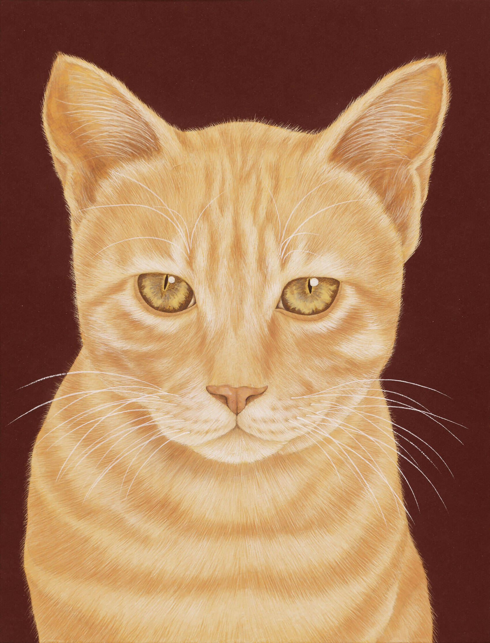 Captured in exquisite detail, the orange cat in this piece connects with the viewer through its amber-coloured eyes filled with curiosity and attentiveness. Its realistic velvety fur and tabby patterns were created with fine, precise lines, taking on a tangible quality that exudes warmth and reassurance. The artist encourages the audience to engage in a tranquil gaze with the subject, creating a liminal space between awareness and unconsciousness. The life-like rendering serves as a poignant reflection of the emotional nuances and expressions we encounter in the faces that populate our lives, making this piece not merely an object of aesthetic admiration but also a mirror of our shared human experience.