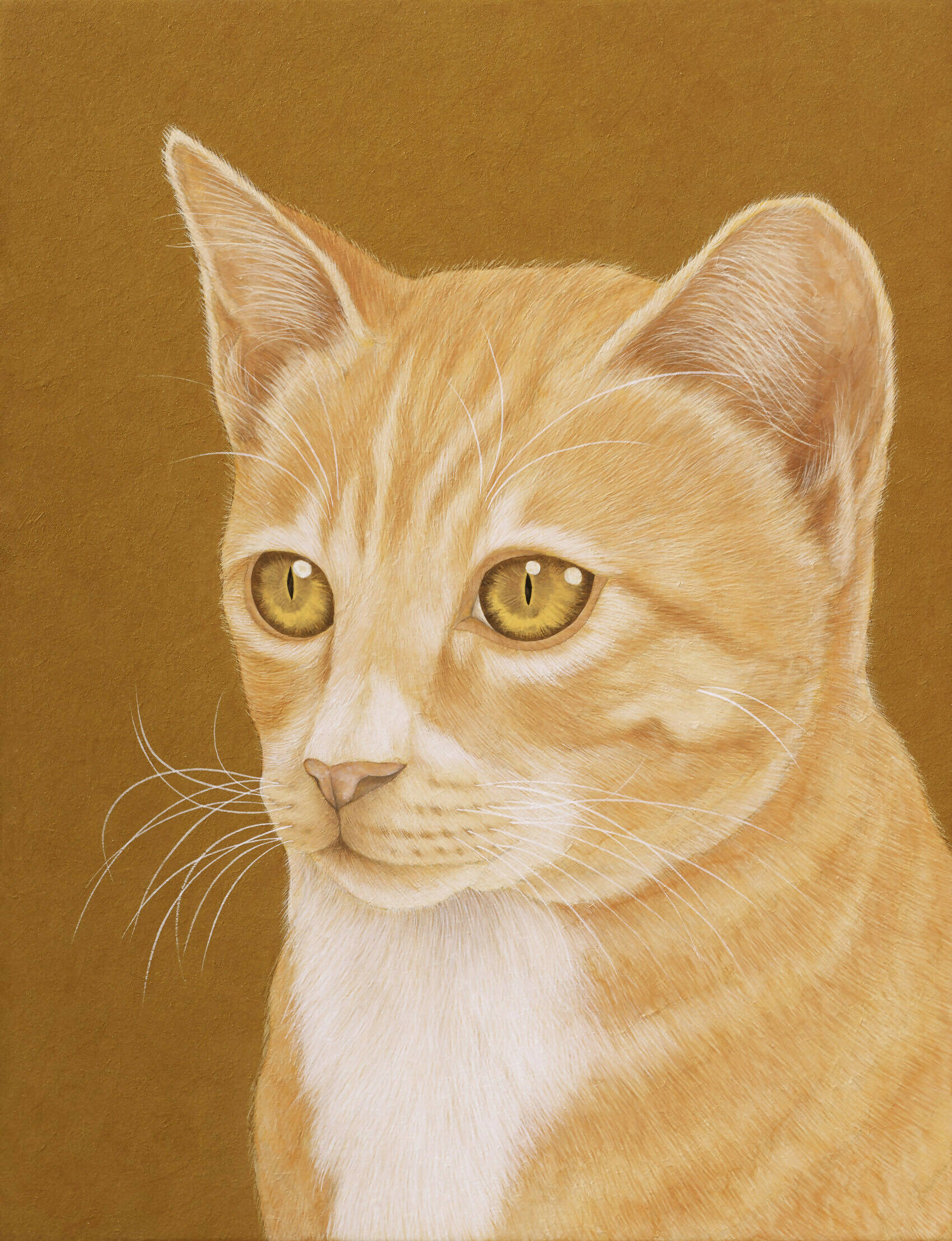 This artwork captivates with the cat's penetrating, jade-like eyes that confront the viewer, encapsulating curiosity and focus. Meticulously executed, the fur texture transcends mere representation; its intricate layering, fashioned through fine lines, imbues the piece with palpable warmth and realism. The work situates itself within the complex interplay of gaze, awareness, and anonymity, evoking reflections on the human condition and identity. It is an elegant inquiry into the boundaries between observer and observed, inviting the viewer into a nuanced dialogue on existence and representation.