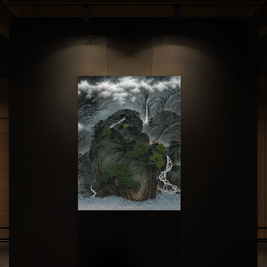 Navigating the serene terrains of Hou Xiantang's paintings, the audience finds itself transported beyond the mundane. Hou employs a distinct M-shaped brush stroke that lends an intriguing blend of vitality and enigma to the mountainous landscapes he presents as his ultimate "hidden paradise." This technique affords remarkable versatility, layering strokes to evoke towering, rugged mountains or employing a softer touch to suggest lush, dense forests.