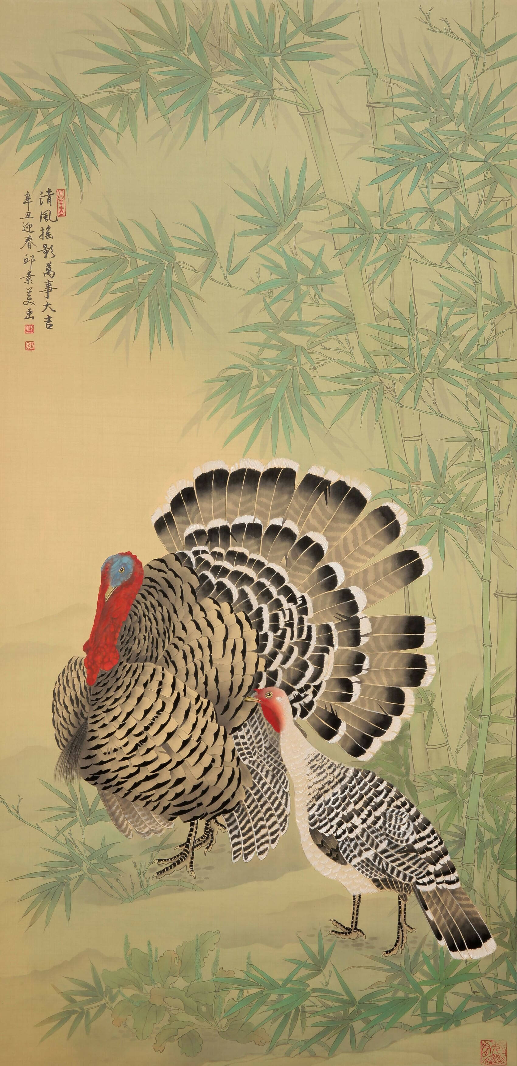 A majestic turkey reveals her vibrant plumes against elegantly arranged bamboo soaring magnificently in the background. The imposing bird's layered feathers boast rich hues of red and blue, complementing its commanding presence. In this piece, the turkey symbolizes a guardian spirit in a household, alluding to its central role in North American Thanksgiving traditions.