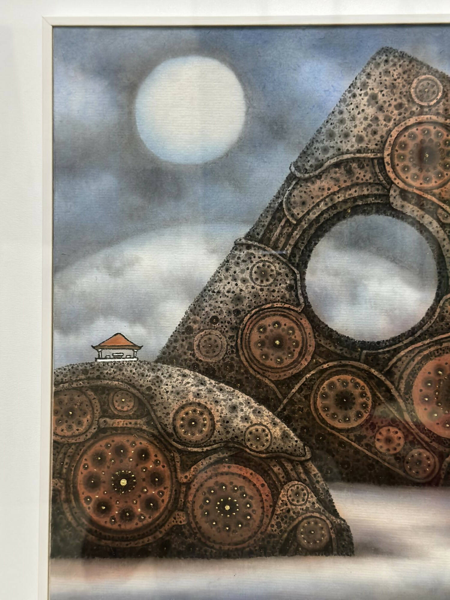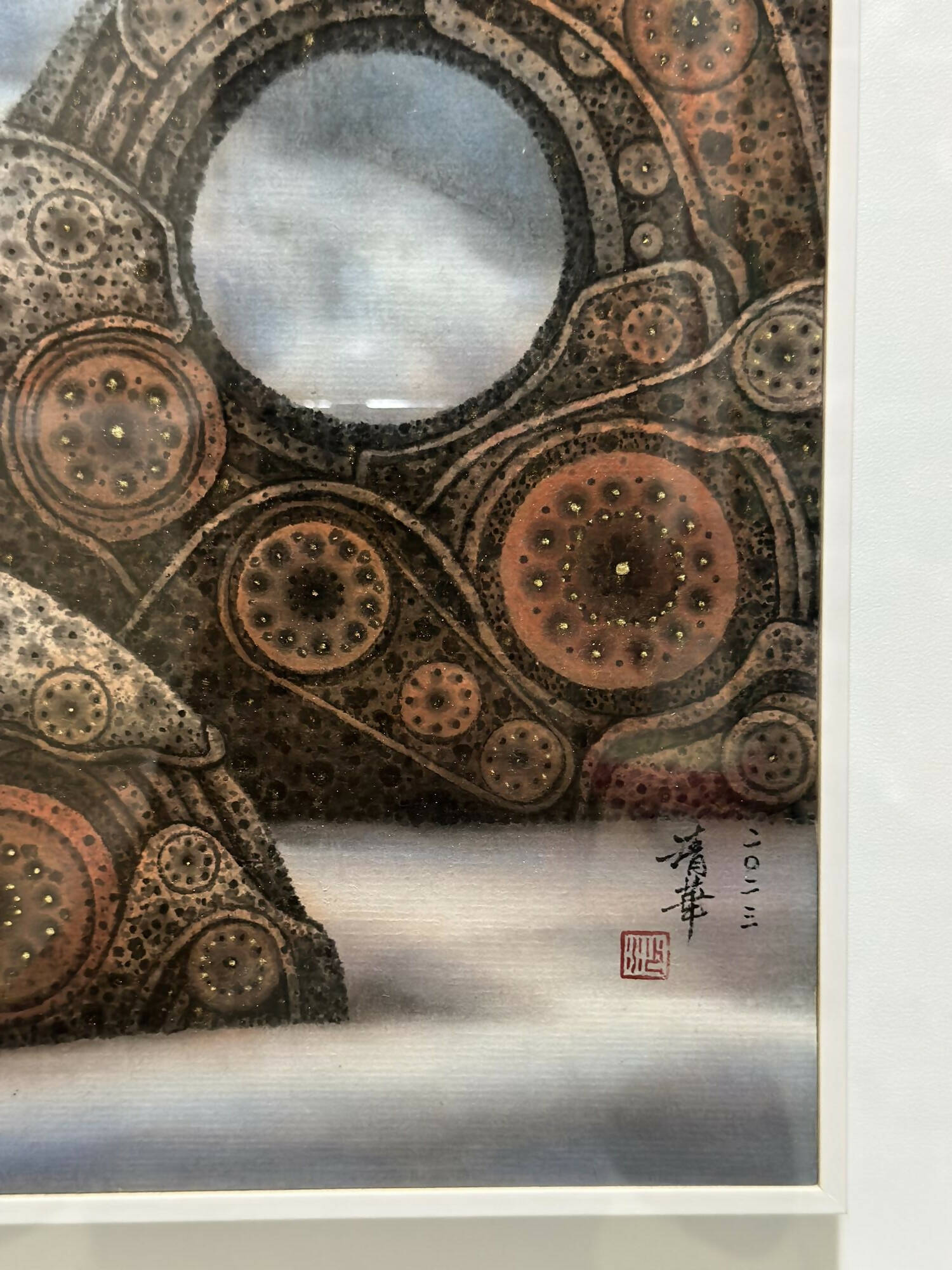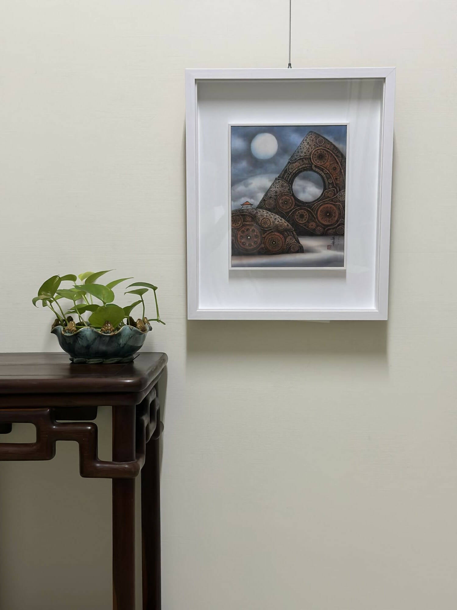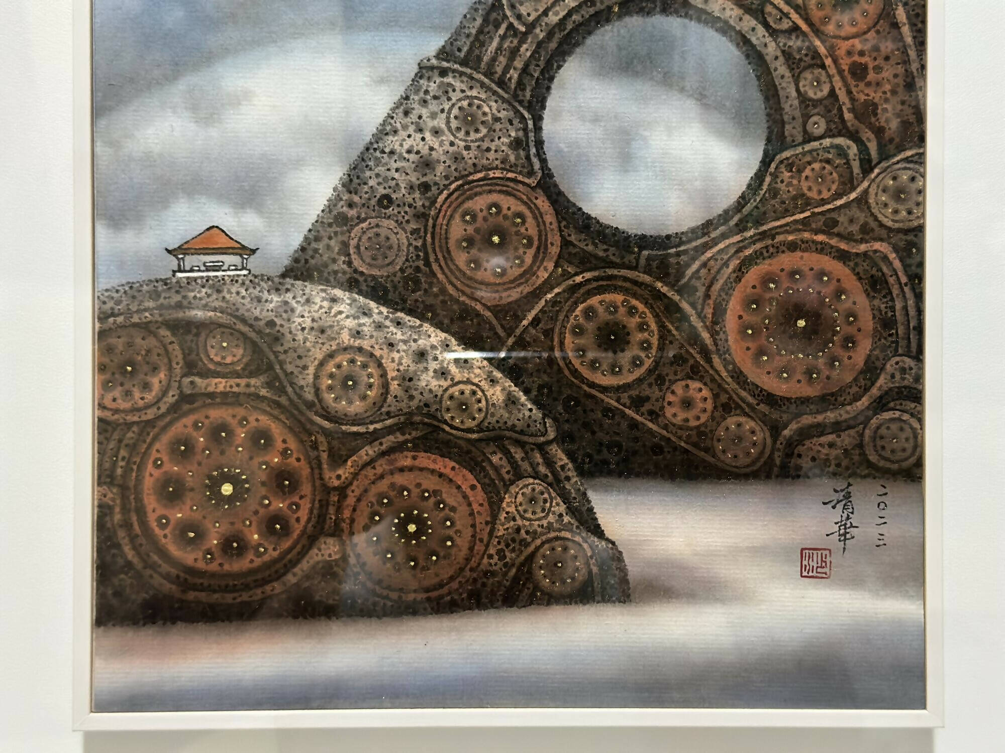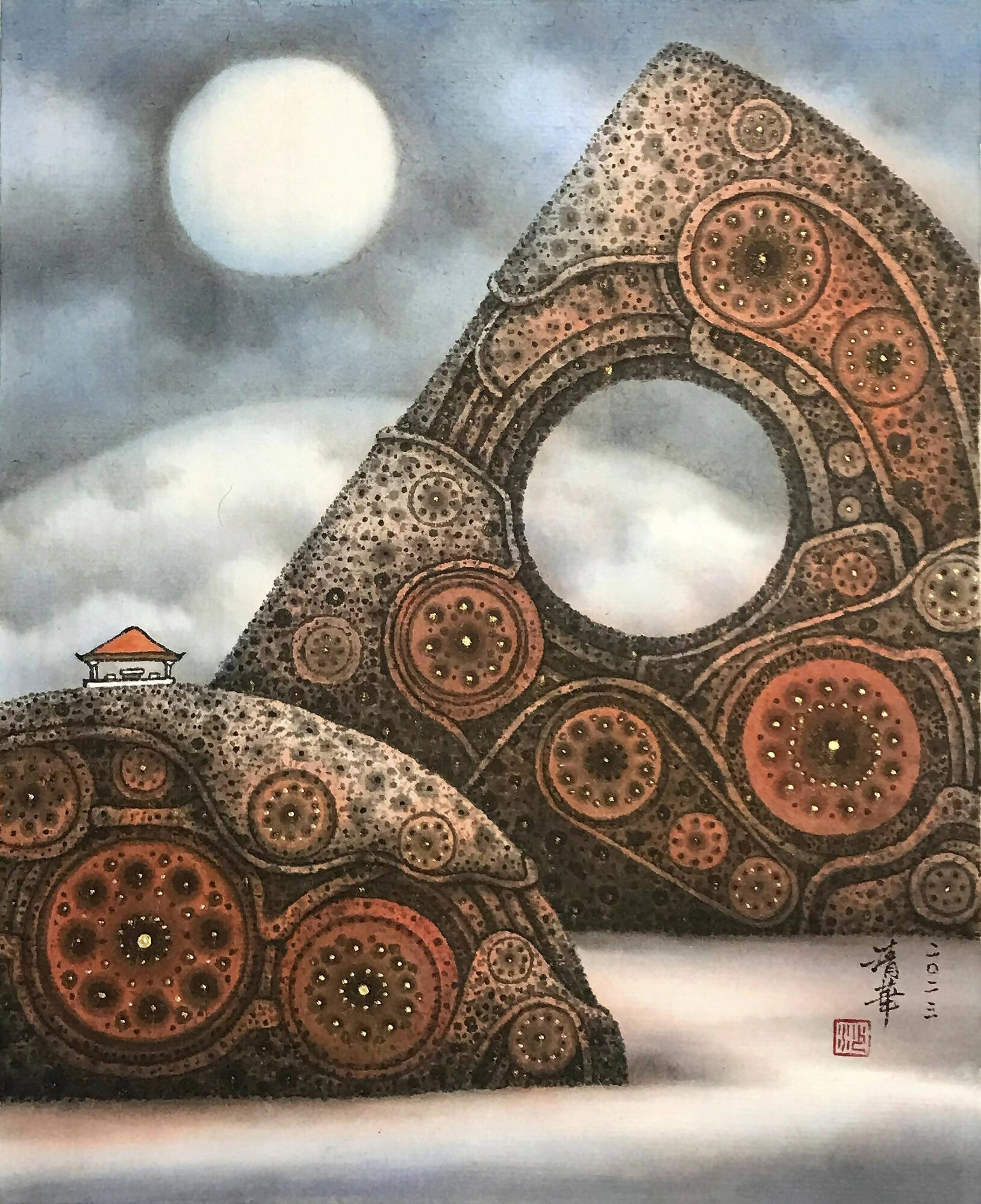 In Sha Qinghua's "Mechanical Landscapes" series, ancient rock surfaces are reimagined, with their myriad cavities morphing into intricate, interconnected fantasy gears. The ceaseless motion of these gears represents the enduring imprints of time's passage, prompting reflections on its relentless flow. Each gearwheel is a testament to the vast interconnectivity of the cosmos.