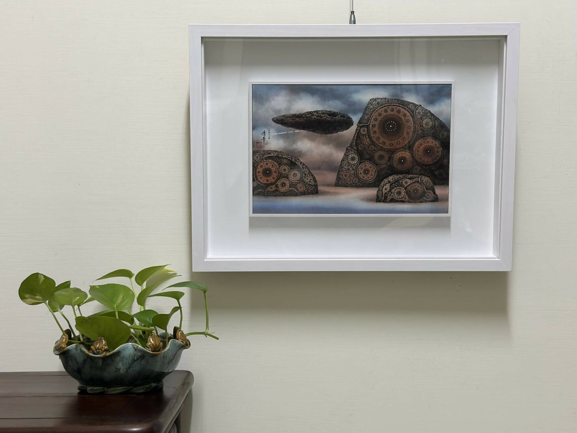 In this piece, an ancient, monumental stone mysteriously hovers in the upper-left quadrant against a vast, overcast expanse, introducing a nuanced balance to the artwork. The levitating mountain symbolizes life's potential for unburdened freedom. Set against the boundless backdrop of the cosmos, the painting reminds the audience that when viewed from a grander perspective, even our most pressing troubles diminish in significance.
