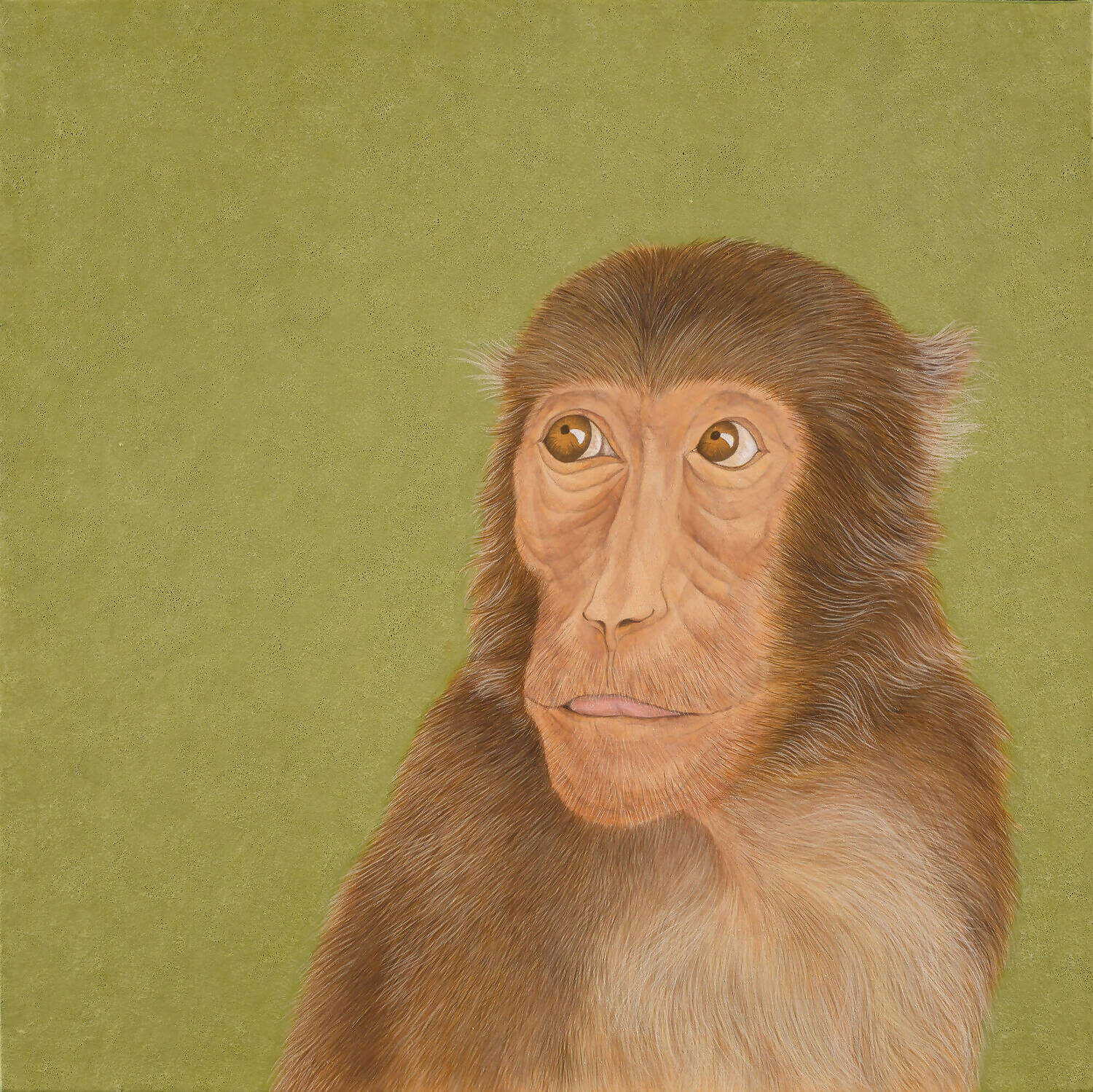 The artist captures an uncharacteristically contemplative moment in the life of a mischievous macaque. Known for their lively and playful nature, the primate here seems engrossed in thought. The artwork shines in its technical mastery, particularly in rendering the animal's fur. Crafted through countless fine lines, each strand of hair is a study in precision, adding intricate layers to create a lifelike, velvety texture. The painting engages the viewer in a quiet dialogue—between the act of looking and being looked at, between conscious awareness and unconscious recognition. This masterful portrayal captures the unique character of its subject and reflects universal expressions and emotions, resonating deeply with our own human experience.