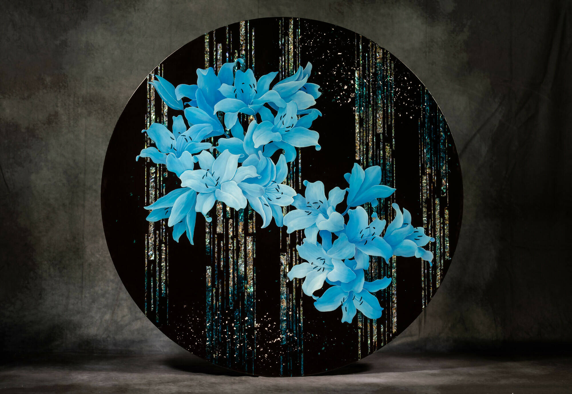 Inspired by the ethereal melodies of Chopin's Nocturne, a favourite of the artist, this artwork captures the evocative essence of the music. At its heart, lilies, painted with a blend of mineral blue and pure resin, shimmer in rhythmic variations of blue, their brilliance juxtaposed against a deep black lacquer. This dance of colour recalls the gentle fragrance of lilies blooming under moonlight, evoking serenity, longing, and nostalgia.