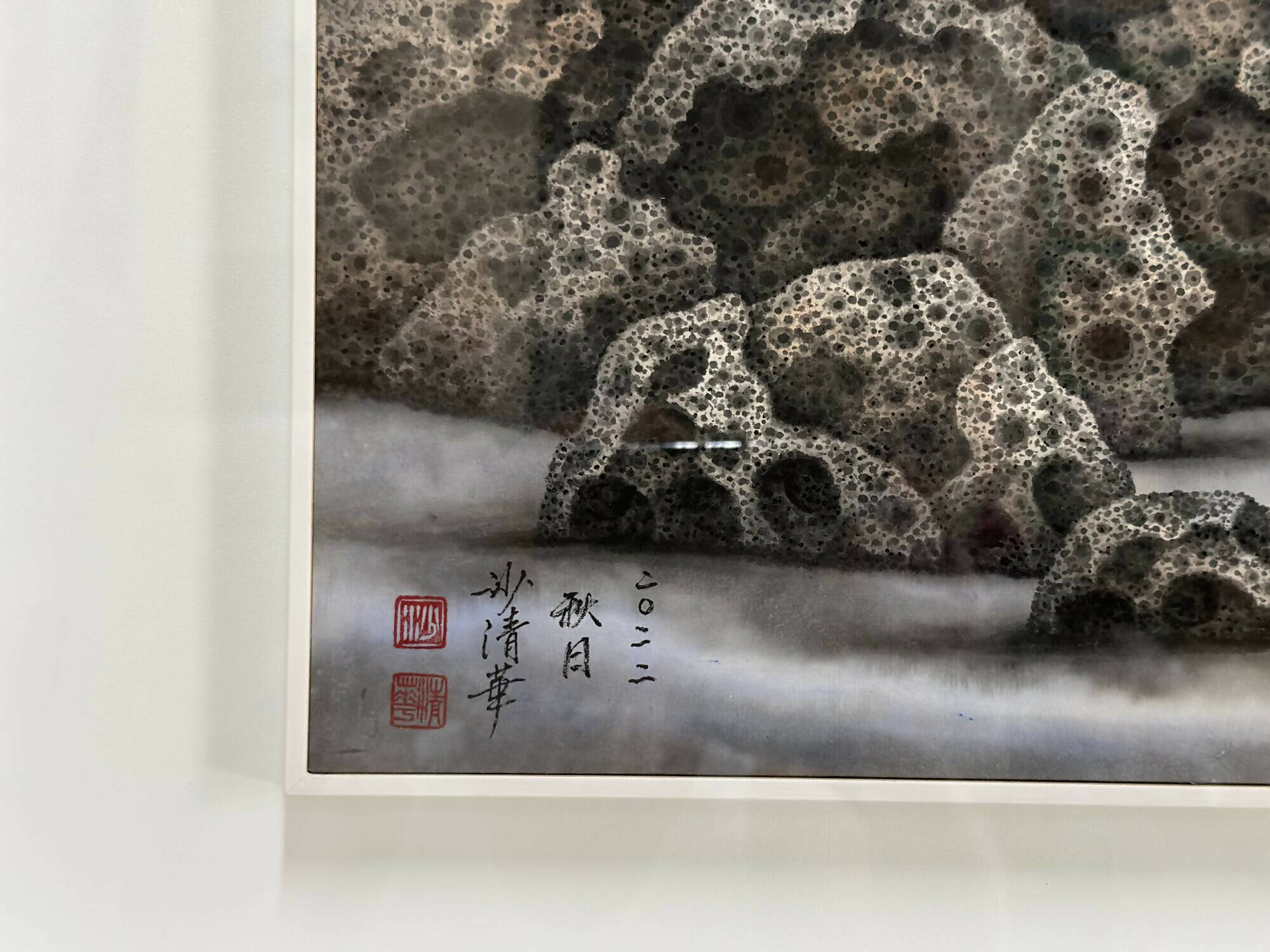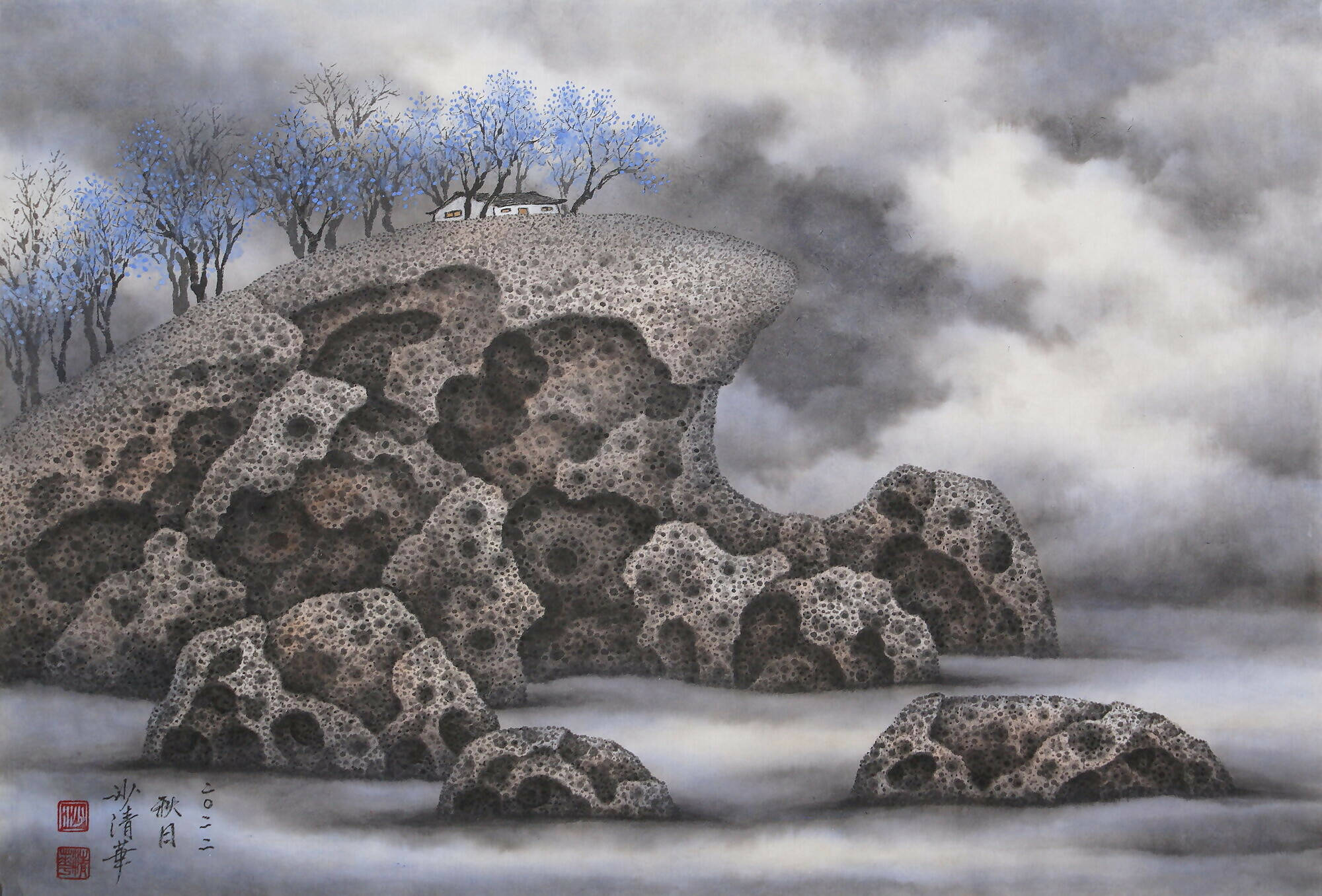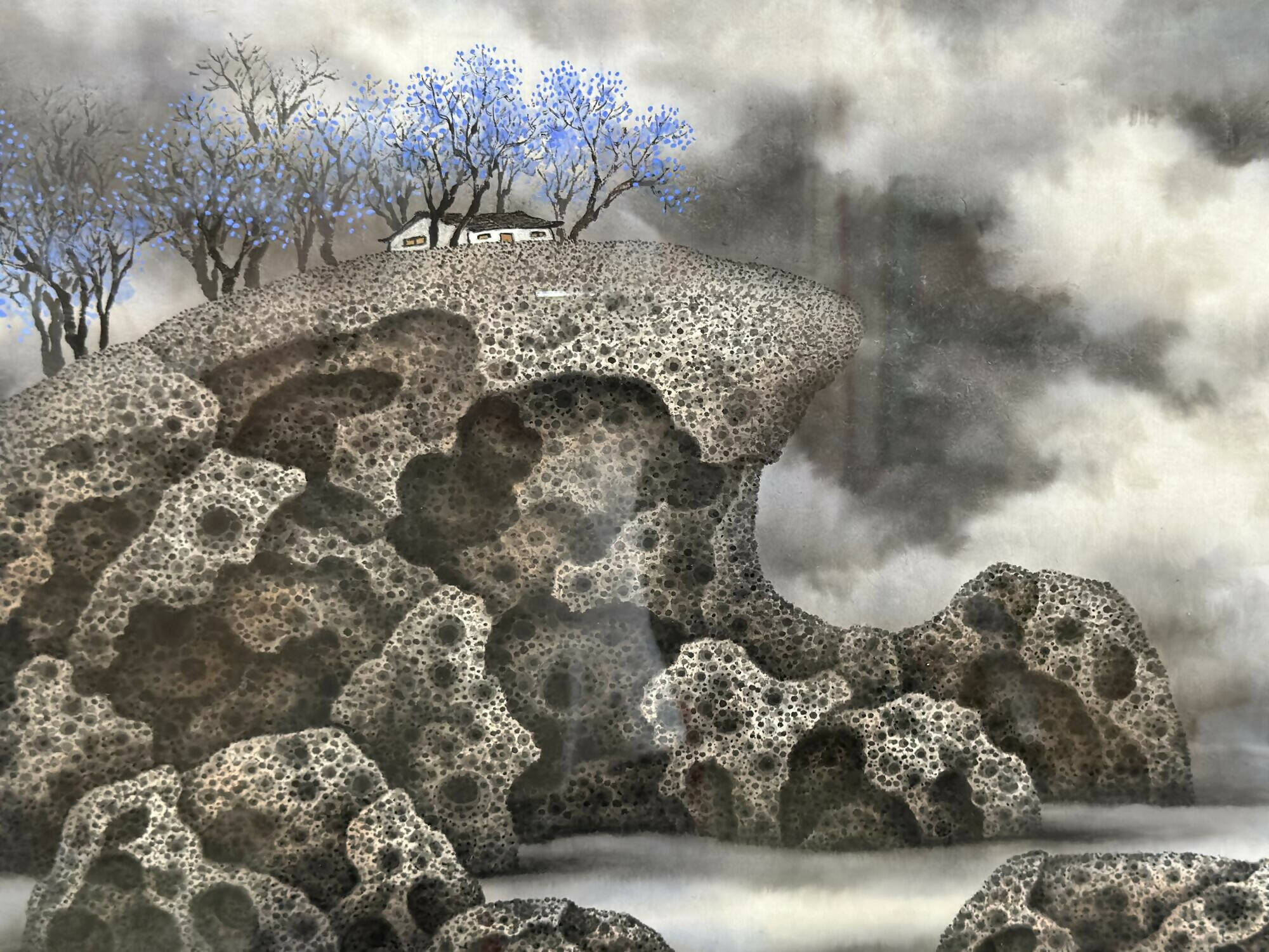 Anchoring this ethereal world are ancient rocks, their surreal textures mirroring the millennia-long weathering seen in "beehive rocks." The realistic depictions of hollow depressions on the rock's surface are achieved through meticulous and repetitive brushwork, which captures the essence of time's passage and hints at the myriad universes they hold.