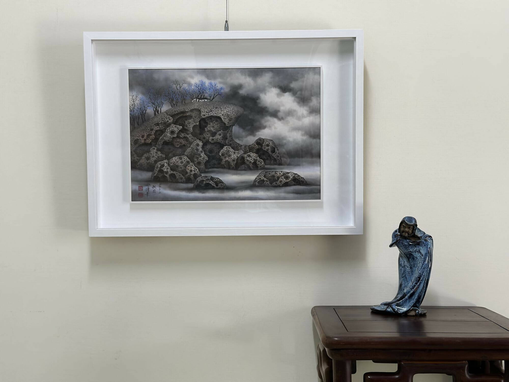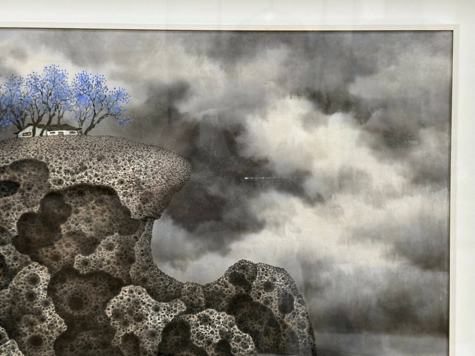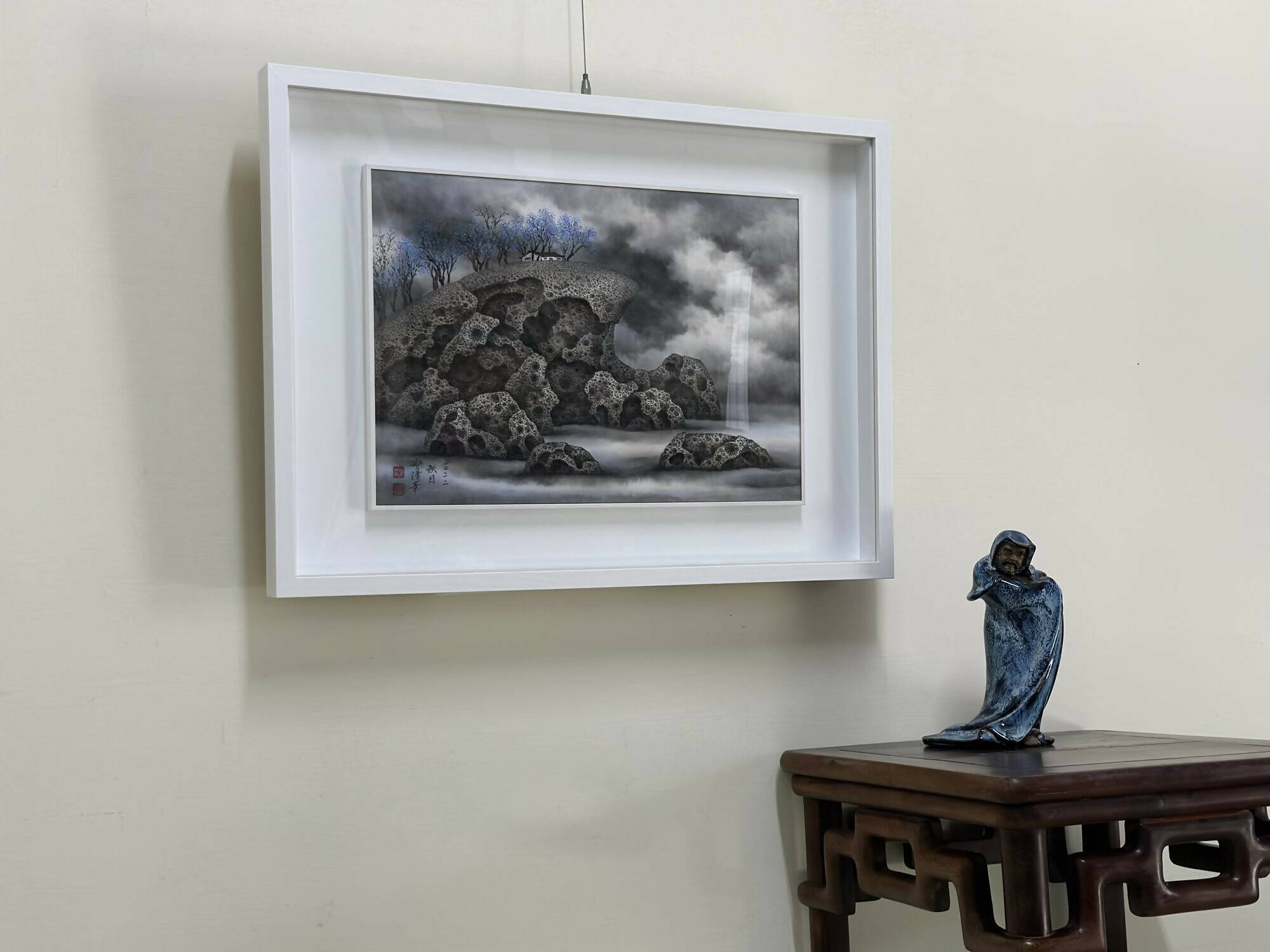 Anchoring this ethereal world are ancient rocks, their surreal textures mirroring the millennia-long weathering seen in "beehive rocks." The realistic depictions of hollow depressions on the rock's surface are achieved through meticulous and repetitive brushwork, which captures the essence of time's passage and hints at the myriad universes they hold.