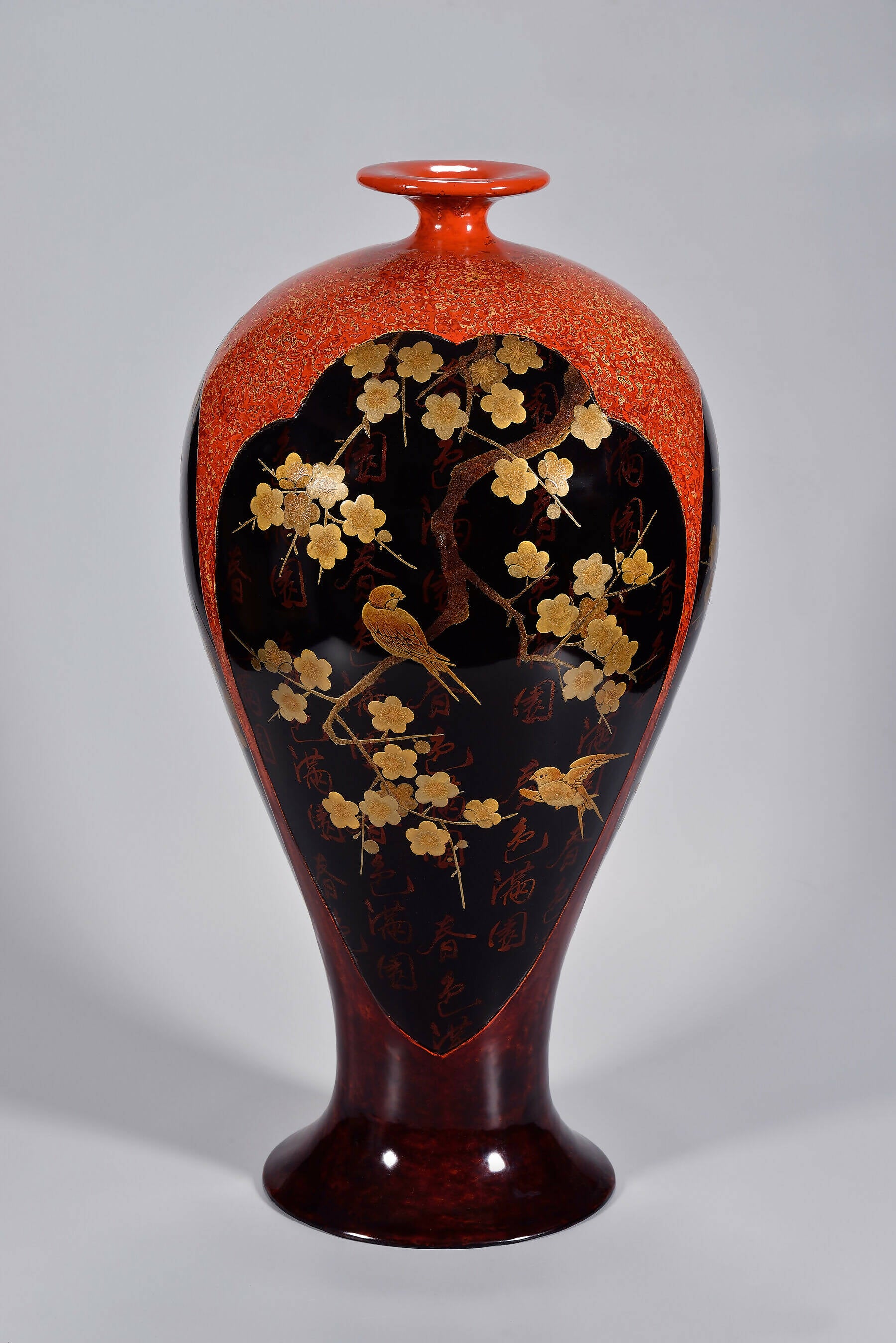 The artwork's plum blossoms and curvaceous branches, ornamented with a solitary bird, are rendered through the revered Maki-e technique, or "sprinkled picture." This ancient art demands the meticulous sprinkling of coloured powders upon the wet lacquer canvas, manifesting intricate and riveting visuals.