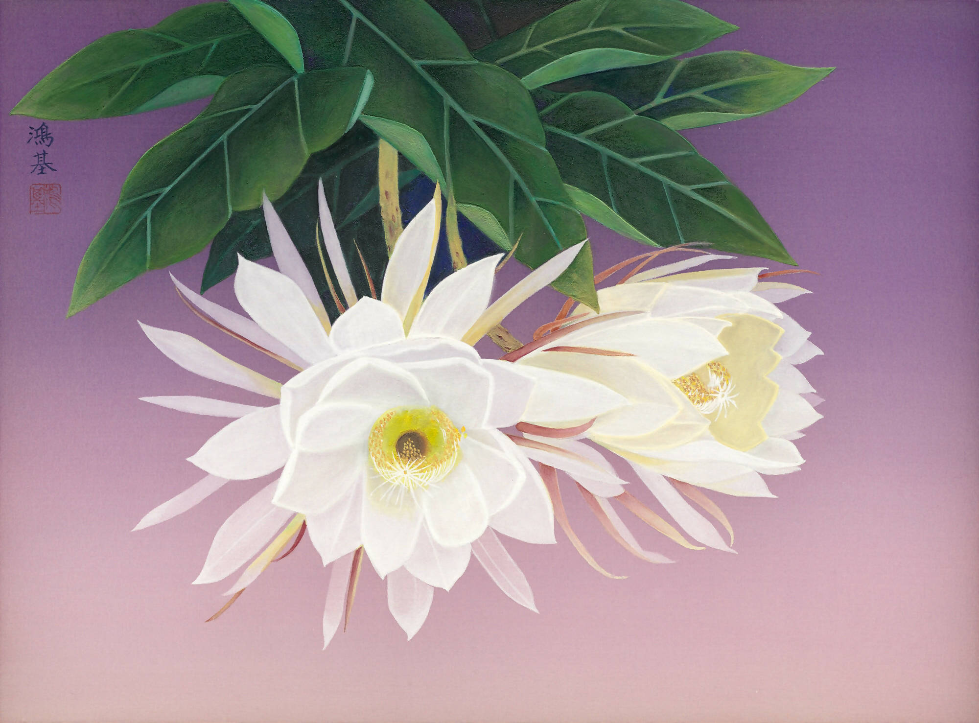 Drawing upon the impeccable technique of Lin Chih-Chu, a master of Taiwanese gouache painting, the artist meticulously illuminates the 'Queen of the Night,' or Epiphyllum. The refined white petals display exquisite detail through subtly varied hues, achieved using layered gradient techniques, bestowing a pronounced distinction of depth and texture among the petal layers. The intricate stamen at the center is portrayed with finesse, magnificently encapsulating the Epiphyllum's gentle and elegant presence.