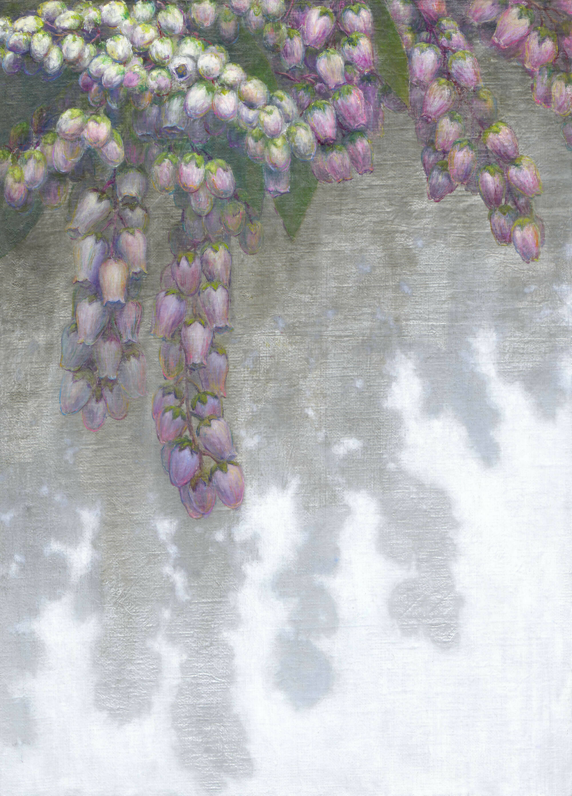 Pieris is a hedge plant native to Eastern and Southeastern Asia, and its distinctive bell-shaped flowers have made it a favored ornamental plant in Taiwanese homes. The painting "Reflections of Pieris" captures the intricate shadows of these Pieris on a white wall. The piece is part of a series of artworks that employ aluminium foil to recreate shadows on canvas.