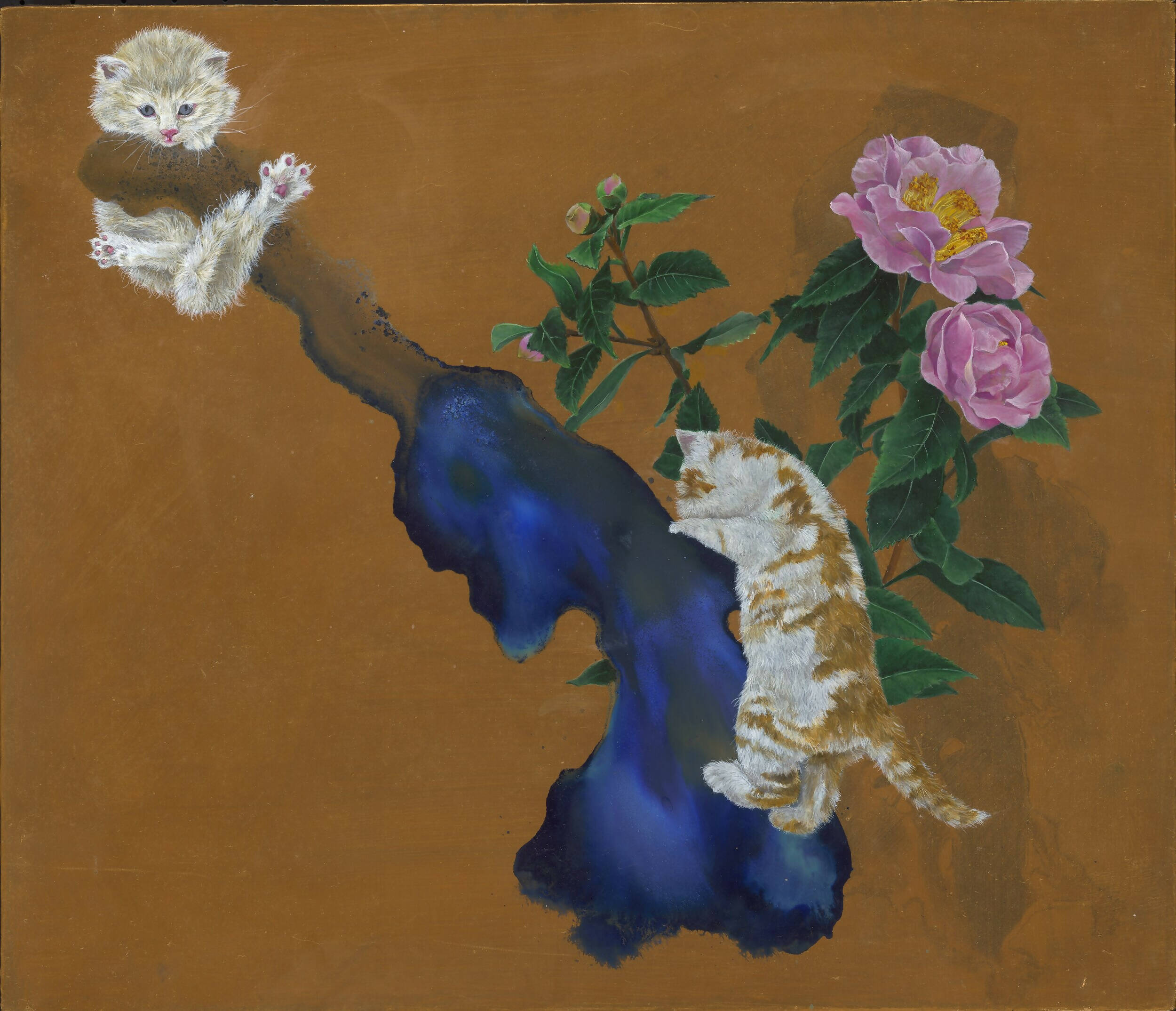 In a dynamic diagonal composition, the artist deftly cultivates visual tension and engages viewers in an emotional narrative. A petite cat clings to the tip of a branch, its eyes expressing an eager entreaty, as if yearning for rescue from the audience. Amid the surrounding blossoms, its companion energetically scales the tree, poised to play the hero in a moment of need.