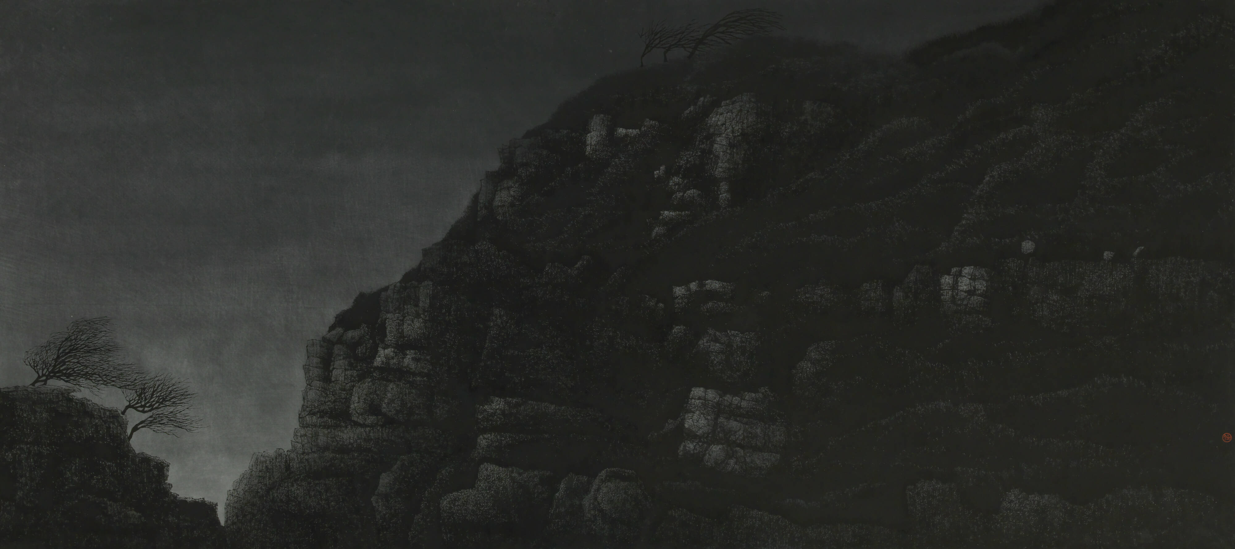 In "Silent Crags," the immovable, massive rocks convey unwavering strength, similar to a silent but imposing figure that radiates power. The exhilaration one feels when immersed in the grandeur of a serene, mountainous landscape at night is akin to hearing a brilliant cellist perform. Amid the stillness, the swaying trees reveal the presence of the wind, reminding us that nature's elements are constantly in motion. They evoke a sense of movement and freedom, underscoring the world's ever-changing dynamics. Through this piece, the artist fosters a dialogue between nature and the observer.