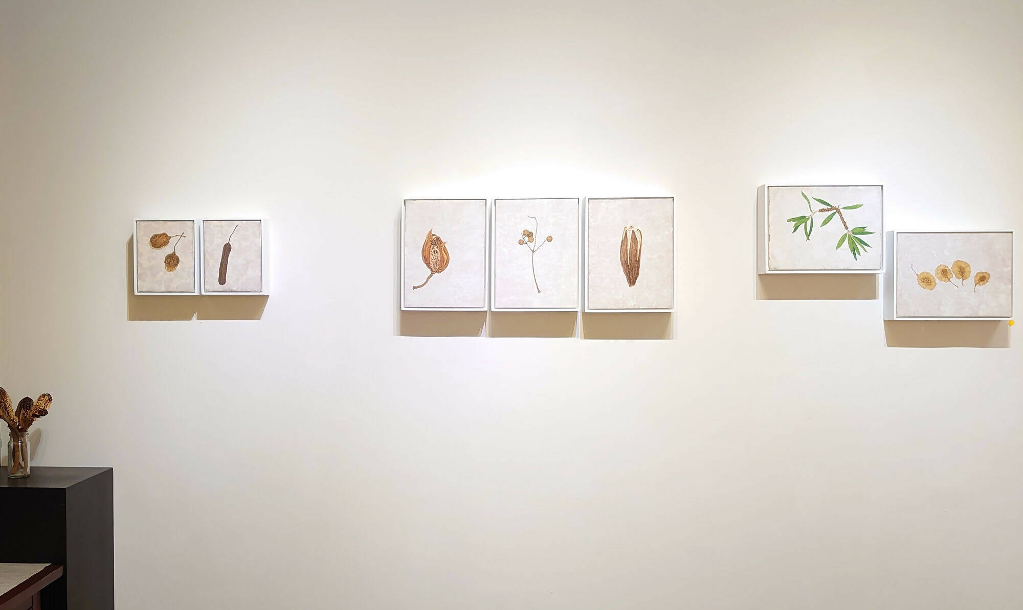 In Chung Shun-wen's compelling series "Collecting Seeds," the artist turns her focus on the fundamental building blocks of life: seeds. Whether they are from peach blossoms or bamboo cypress, each seed is rendered as it finds its place in the fertile soil, a momentary pause in its journey toward growth and renewal. Created using carefully chosen mineral pigments, the artist's precise brushwork elevates these diminutive seeds into profound symbols of the cyclical nature of existence. This piece transforms the seemingly mundane into an eloquent testament to life's inherent potential and constant renewal.
