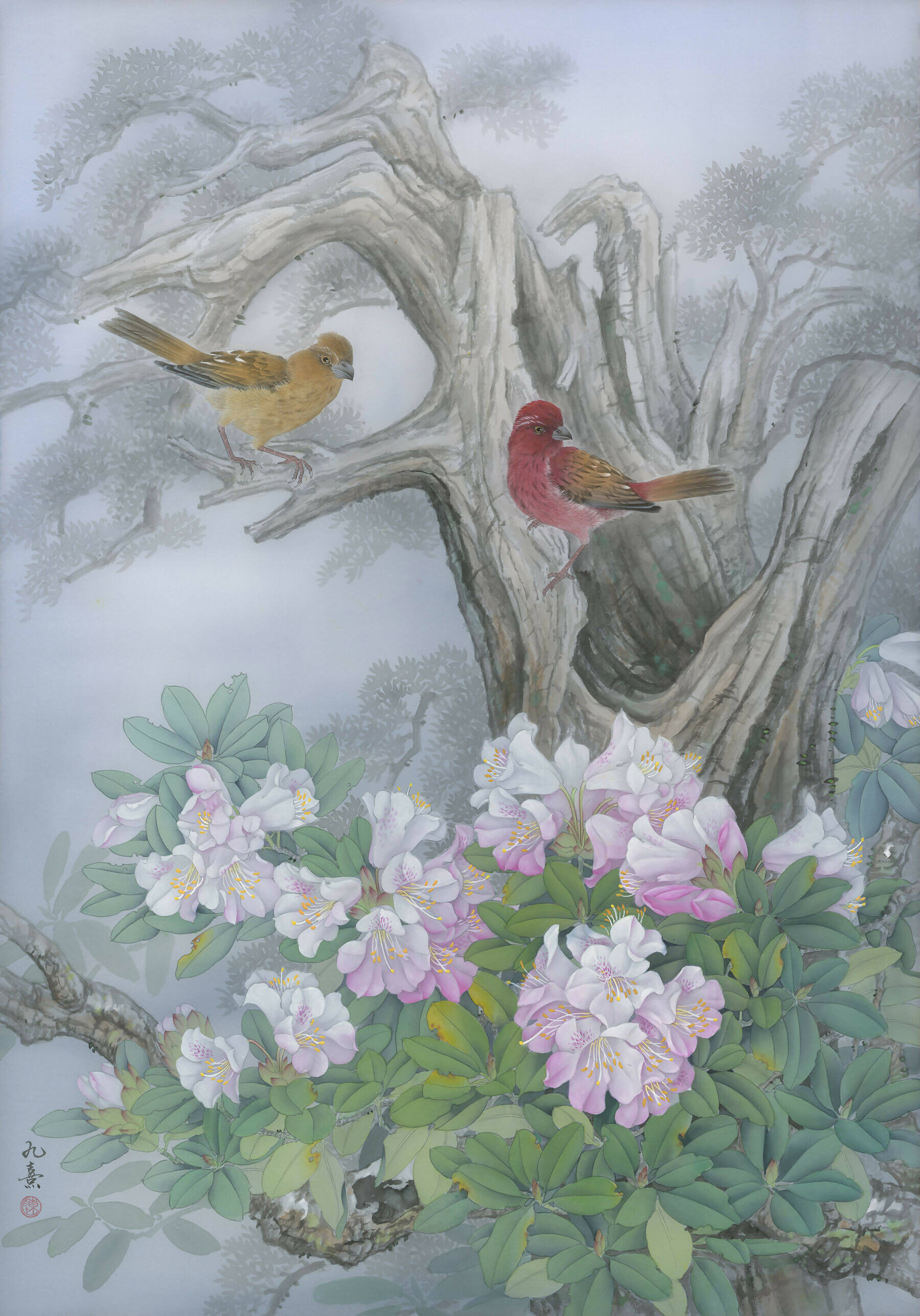 His artistic endeavors extend beyond mastering Gongbi's technique. Chen explores the expressive depths of this art form and broadens its horizons. He innovatively blends traditional Gongbi with diverse mediums: Eastern mineral pigments, Western water-based colors, and contemporary tools like fan-shaped brushes and spray guns. These additions enrich his color spectrum and accentuate the texture and detail of his creations.