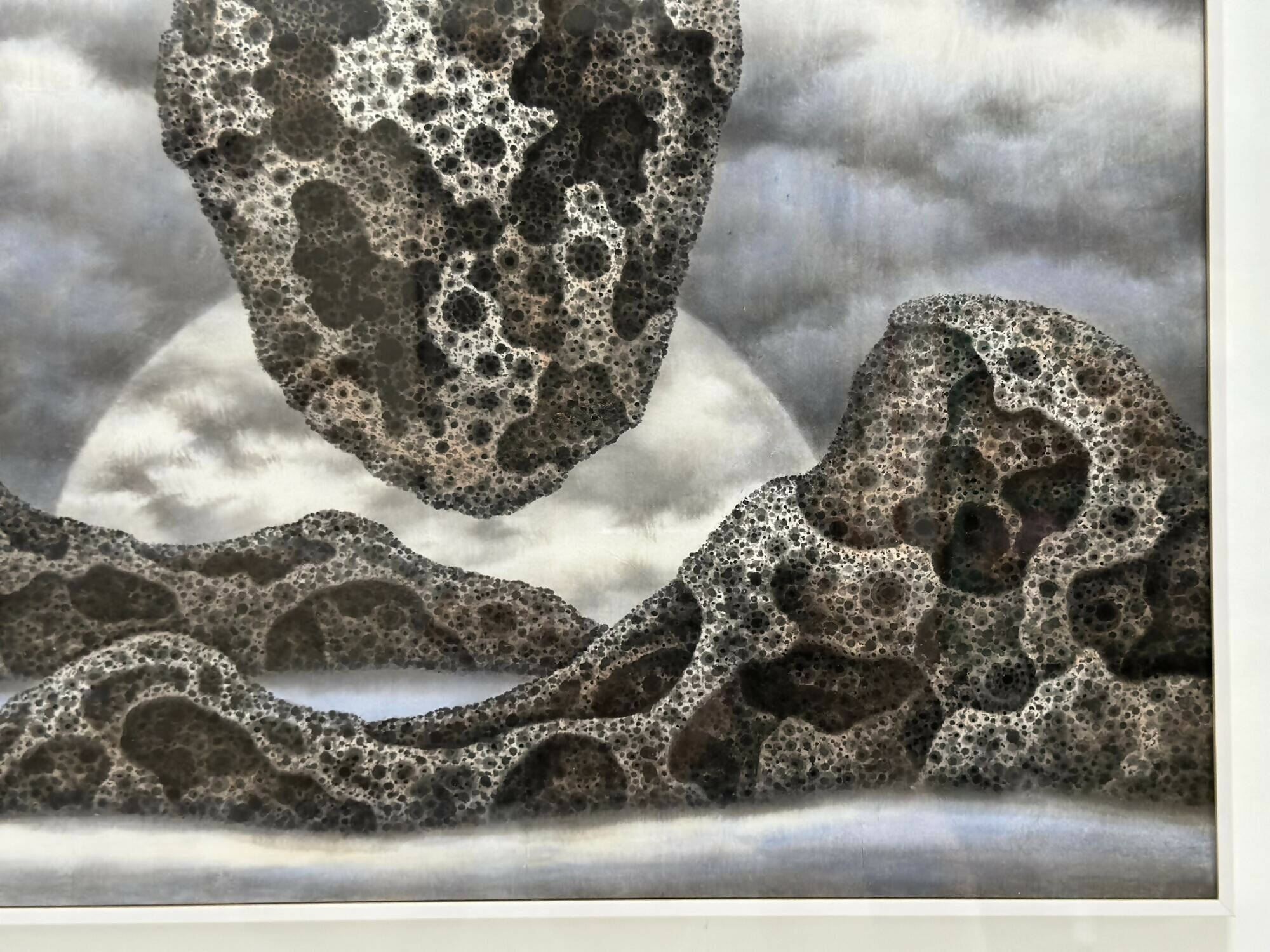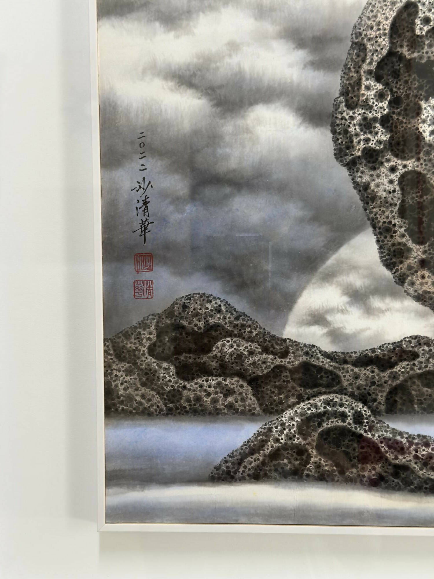 Anchoring this ethereal world are ancient rocks, their surreal textures mirroring the millennia-long weathering seen in "beehive rocks." The realistic depictions of hollow depressions on the rock's surface are achieved through meticulous and repetitive brushwork, which captures the essence of time's passage and hints at the myriad universes they hold.