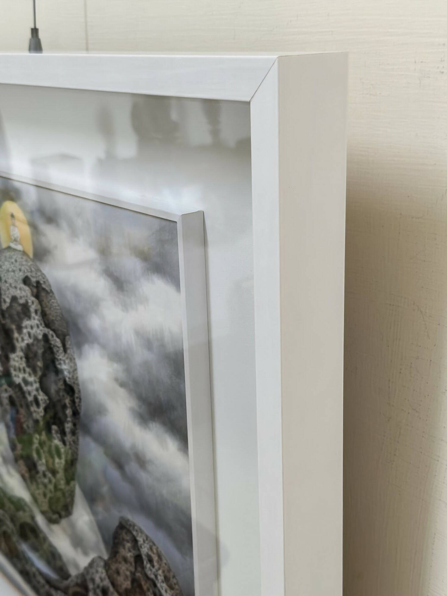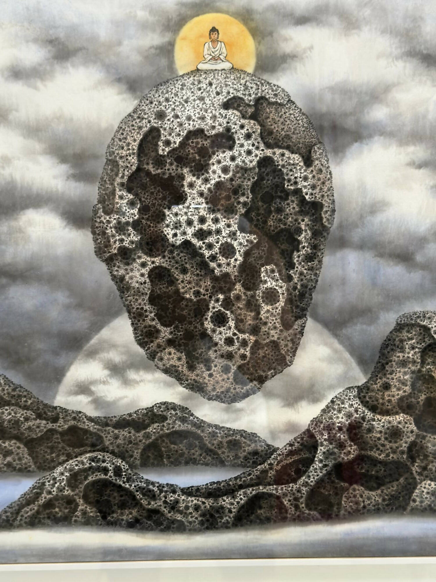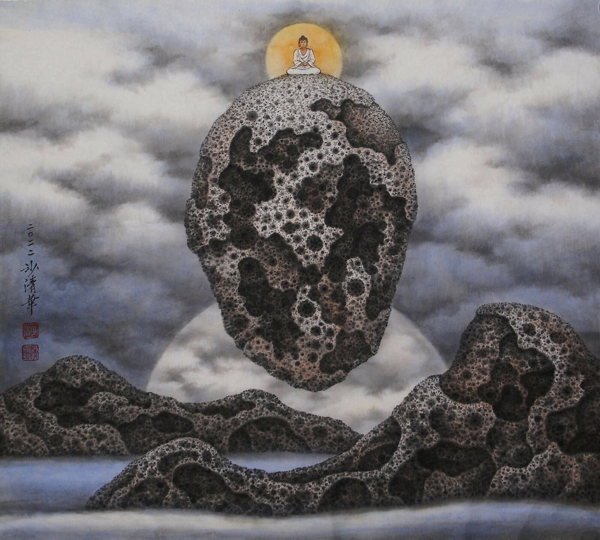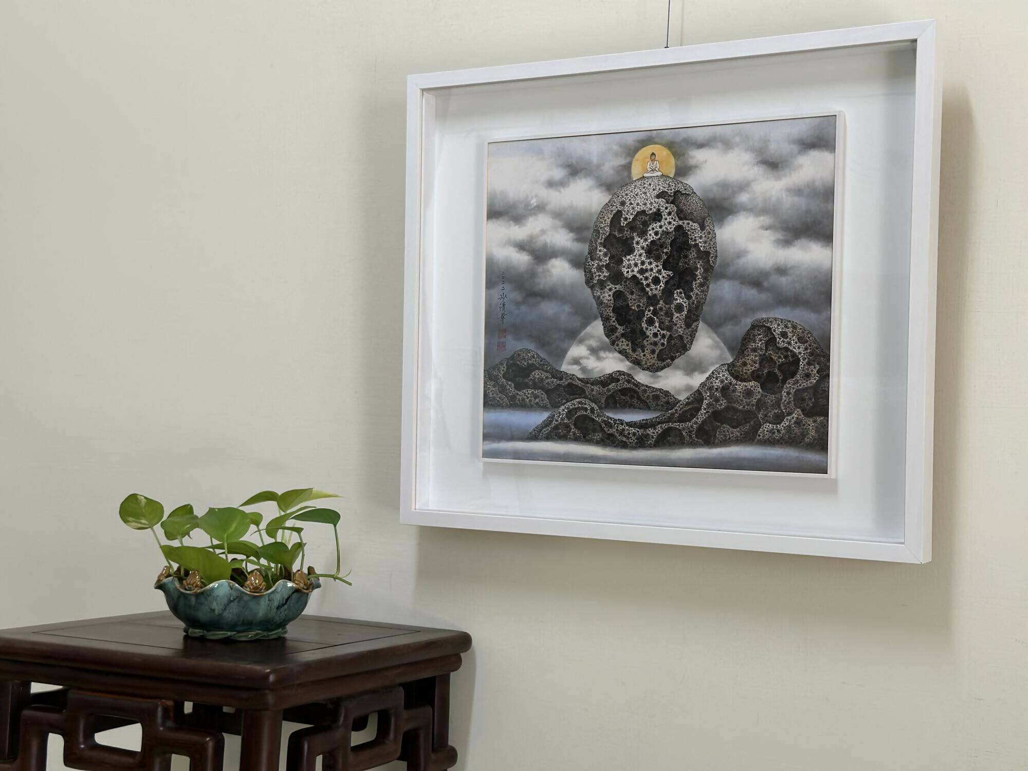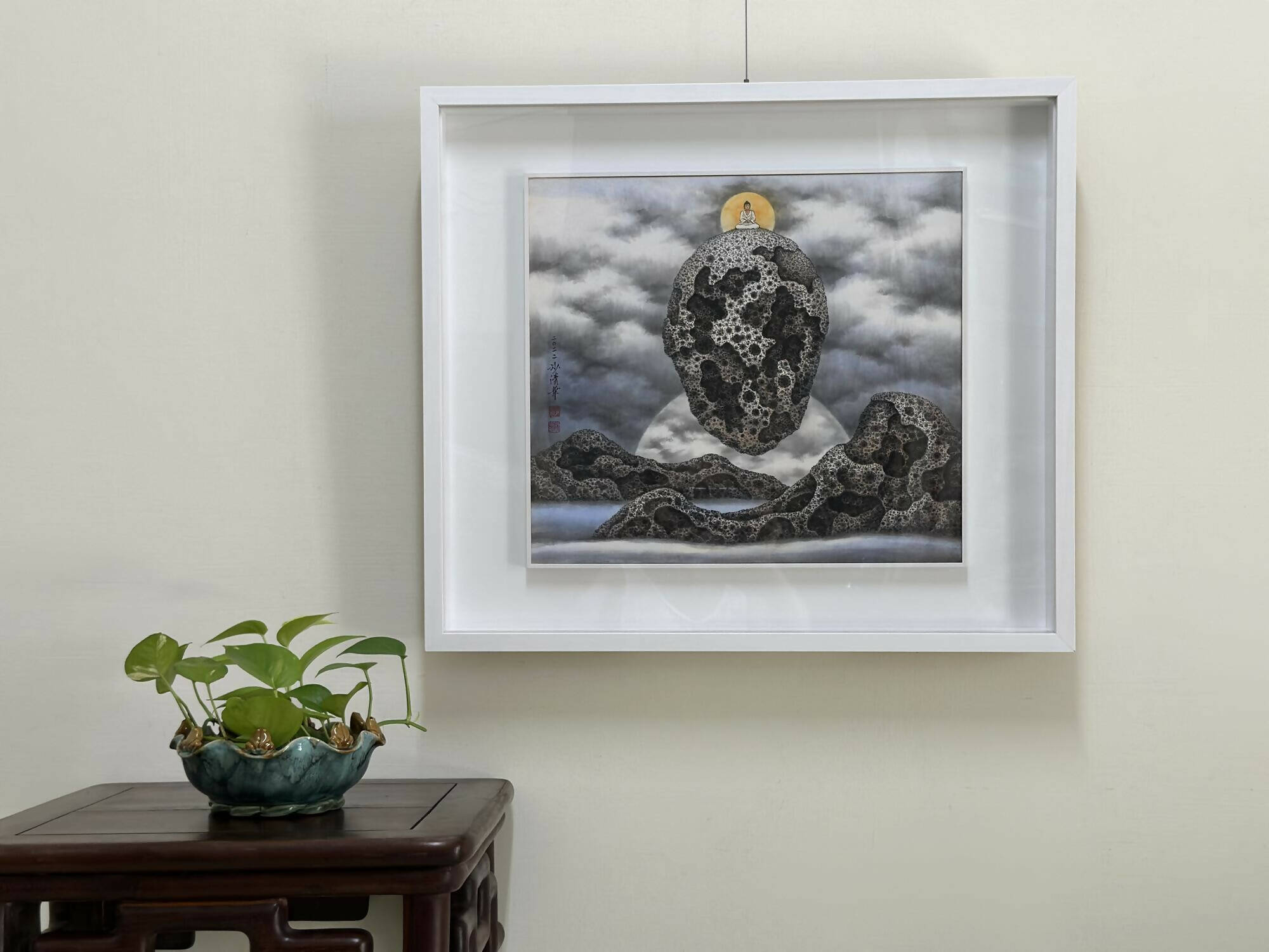 Against an expansive cosmic horizon shrouded in ethereal mists, a monumental stone levitates, crowned by a Buddha. This serene figure epitomizes worldly wisdom and represents the artist's profound hopes for humanity. The piece offers a profound visual and a deep spiritual message.