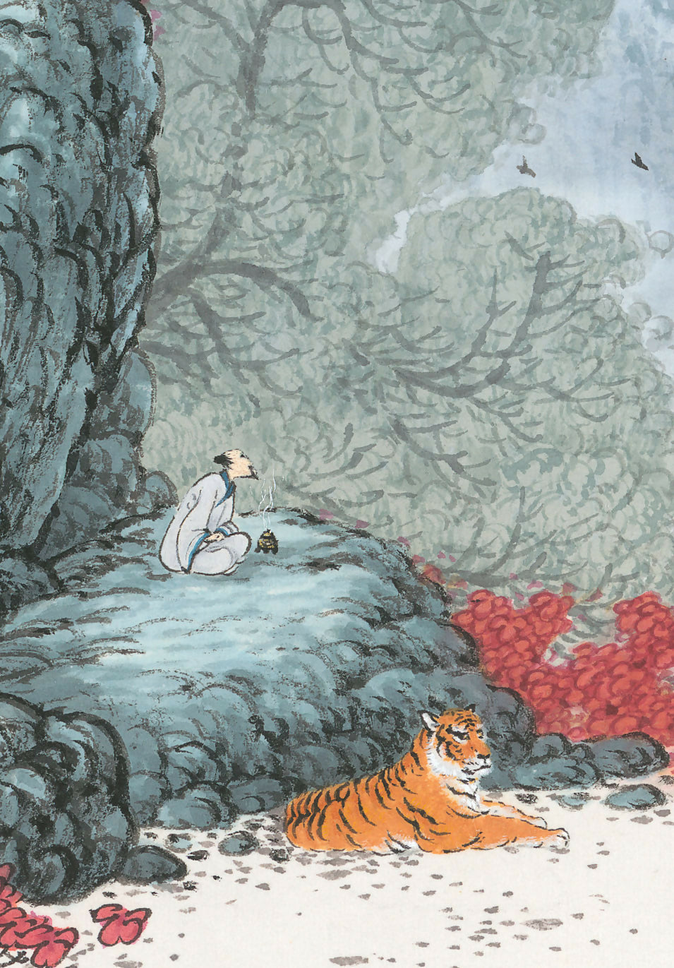 Accompanying the figure in the scenic vista is a majestic tiger, evoking the sentiment of Siegfried Sassoon’s verses: "In me the tiger sniffs the rose." Even amid ambitious pursuits, one can find moments to pause and admire the delicate beauty that abounds around us.