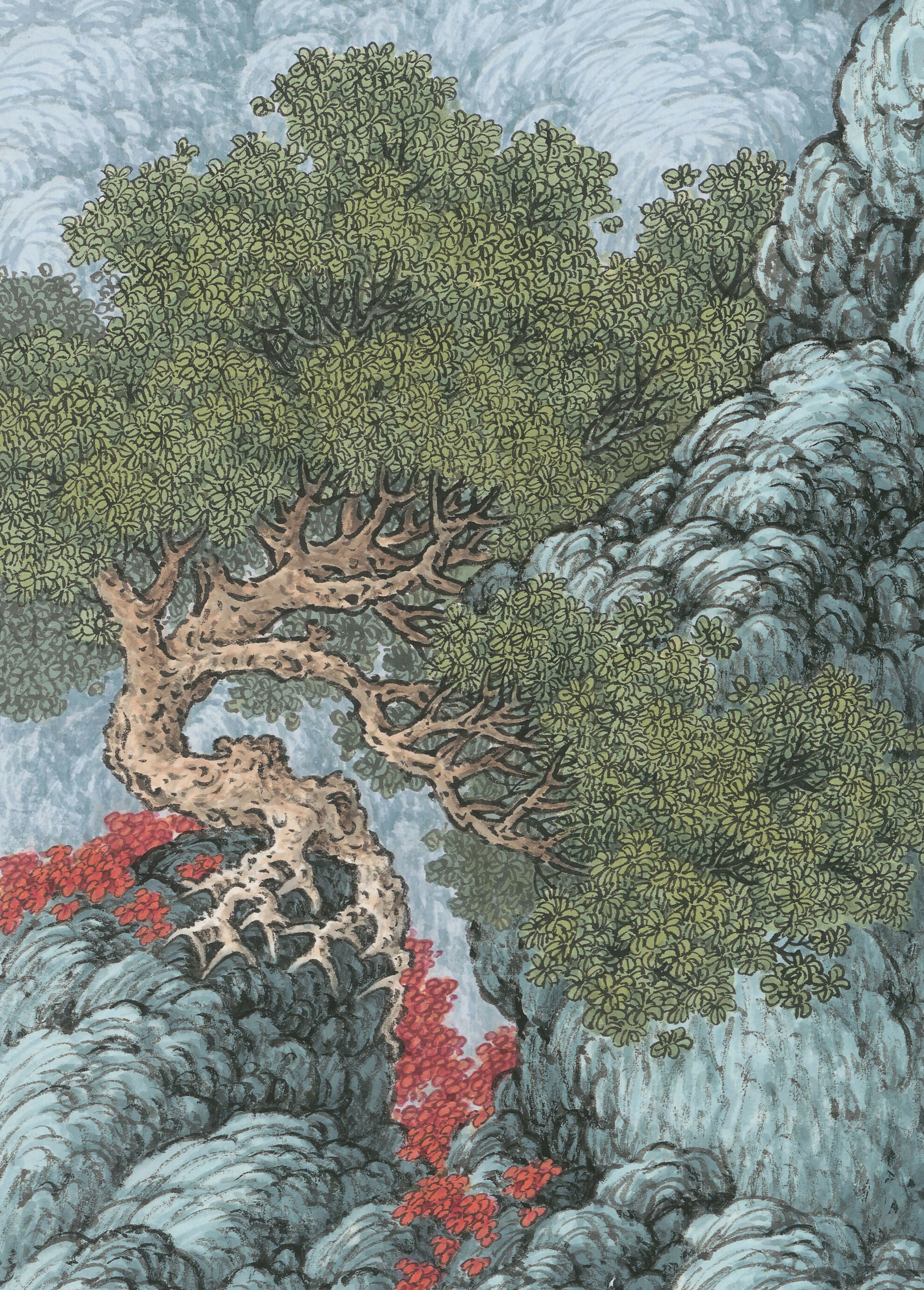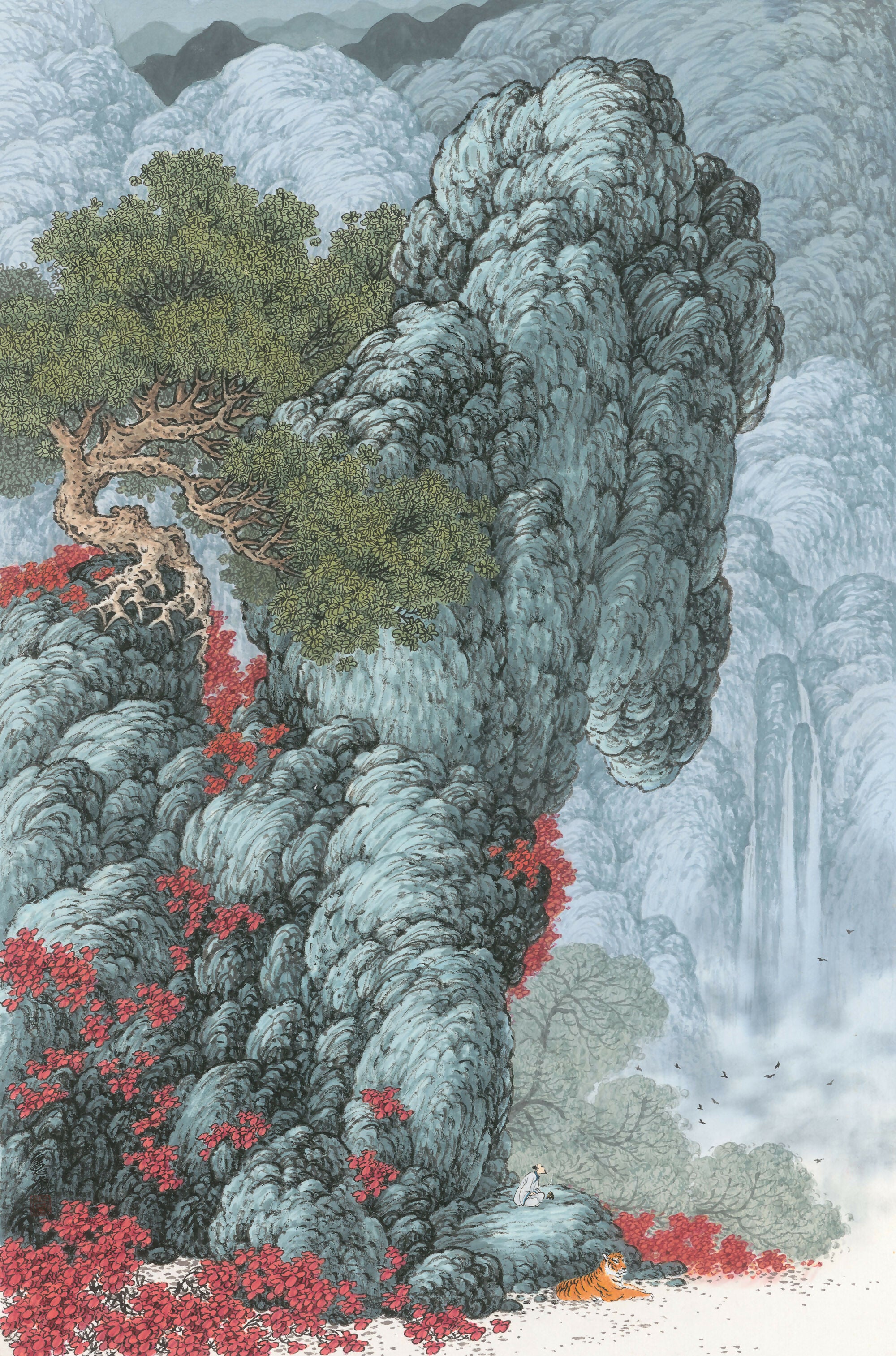 In the foreground, a striking stone of unique coloration—reminiscent of icy coldness—dominates nearly half of the composition, conveying both strength and tranquility. A close examination of the mountains reveals the artist's masterful brushwork, characterized by abundant "flying white" strokes. These swift and dynamic marks, created as the brush glides across the canvas, capture the artist's signature brushwork style, depicting the textures of the mountains as both robust and unrestrained.