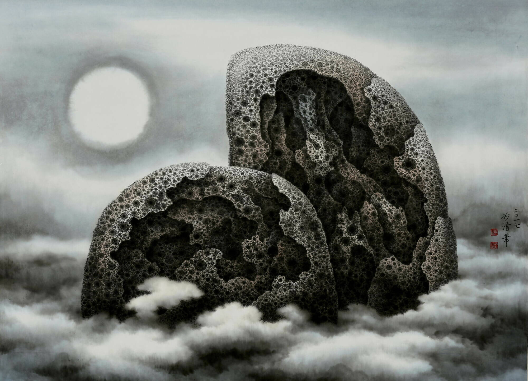 Set against the backdrop of a full moon, two imposing mountains dominate the canvas, epitomizing a world where "harmony between heaven and humanity" reigns. The artwork encapsulates a profound energy, distilling vastness into a refined yet potent form.