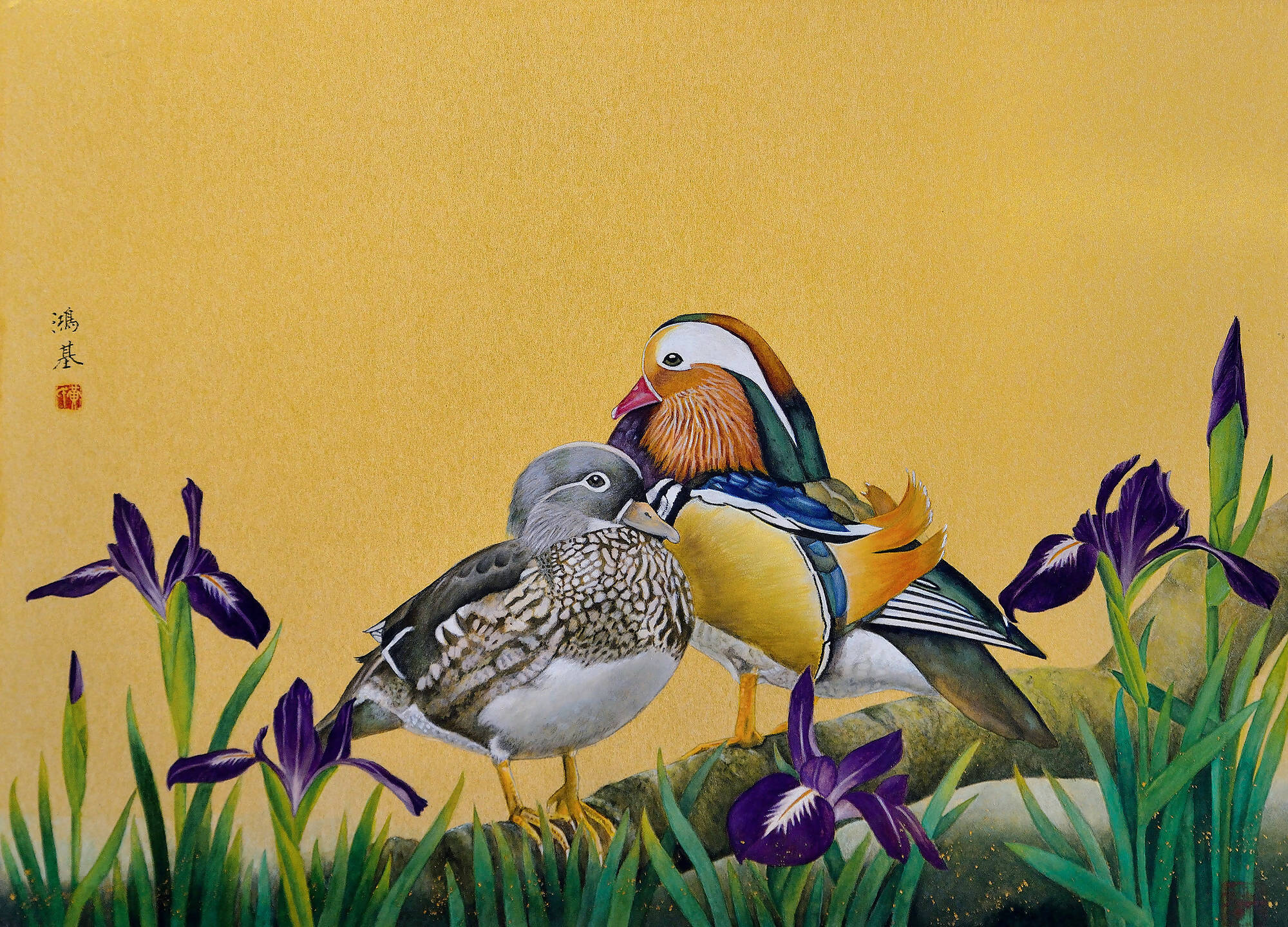 The artist expertly animates a pair of mandarin ducks in vivid plumage, as if kissed by sunlight. Each strand, meticulously depicted, radiates with an iridescent glow.