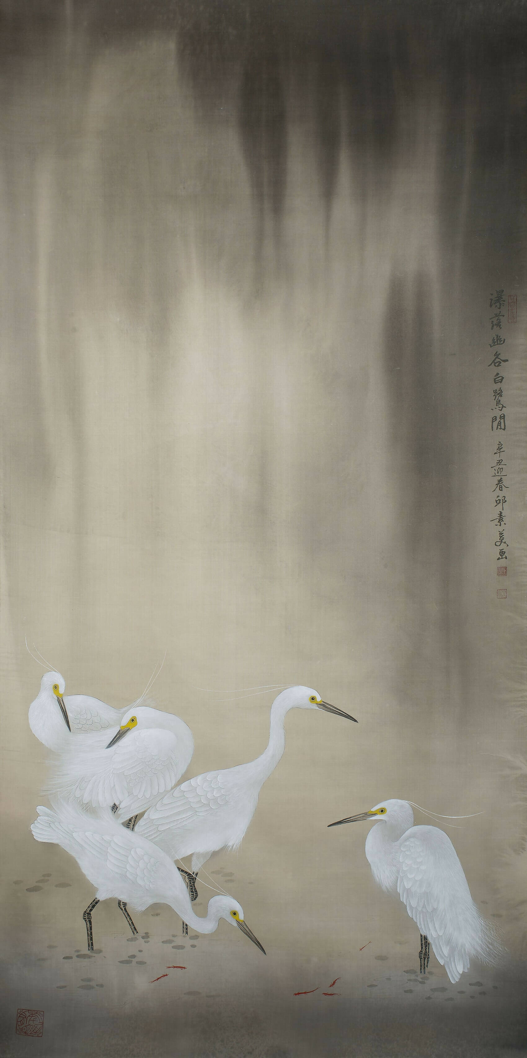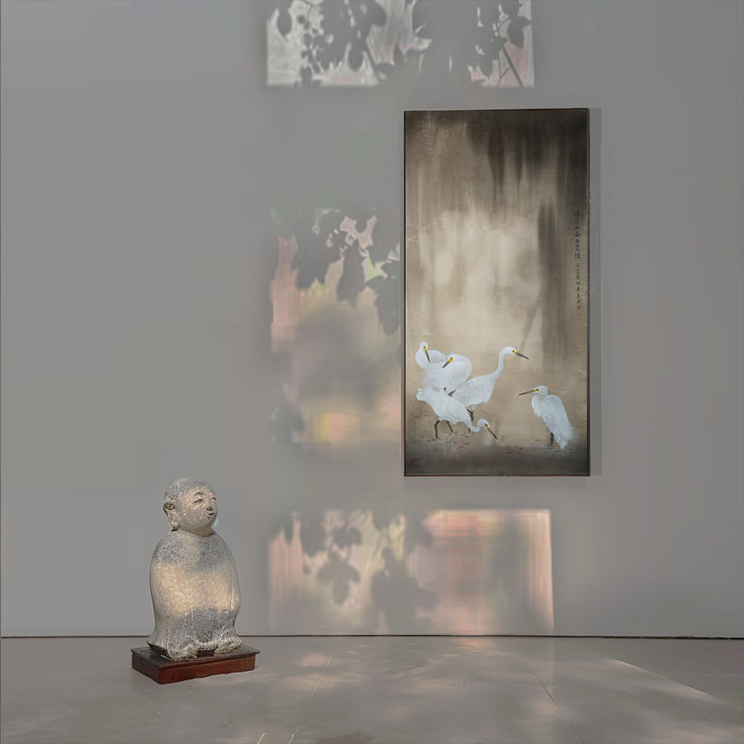 The artist employs masterful ink-wash strokes to evoke a waterfall's vigorous cascade and ethereal mist in this piece titled ""Veil of Mist."" A cadre of white egrets frolics in the shallows below, their immaculate feathers and graceful postures exquisitely rendered. This work captures a poignant paradox between natural energy and tranquil beauty through varied brush strokes and dimensional textures.