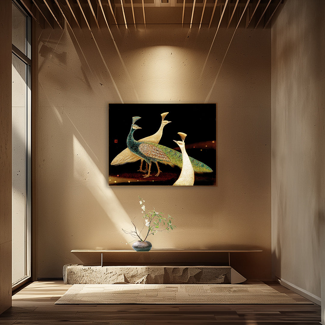 Against a lustrous, deep, ebony lacquer backdrop, the elegance of the peacock comes alive. Two ethereal white peacocks, delicately adorned with hand-prepared eggshell fragments—painstakingly curated by removing the inner membrane to immortalize the eggshell's fragile allure—captivate with their serene grace and intricate patterns.
