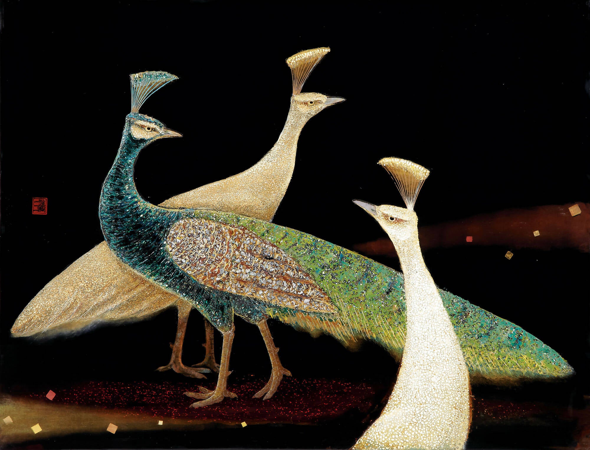 Created by Lacquer Master Wang Ching-Shuang, this artwork employs the intricate techniques of eggshell and pearl shell inlay to vividly capture the dynamic reactions of peacocks to the unexpected sounds of nature.